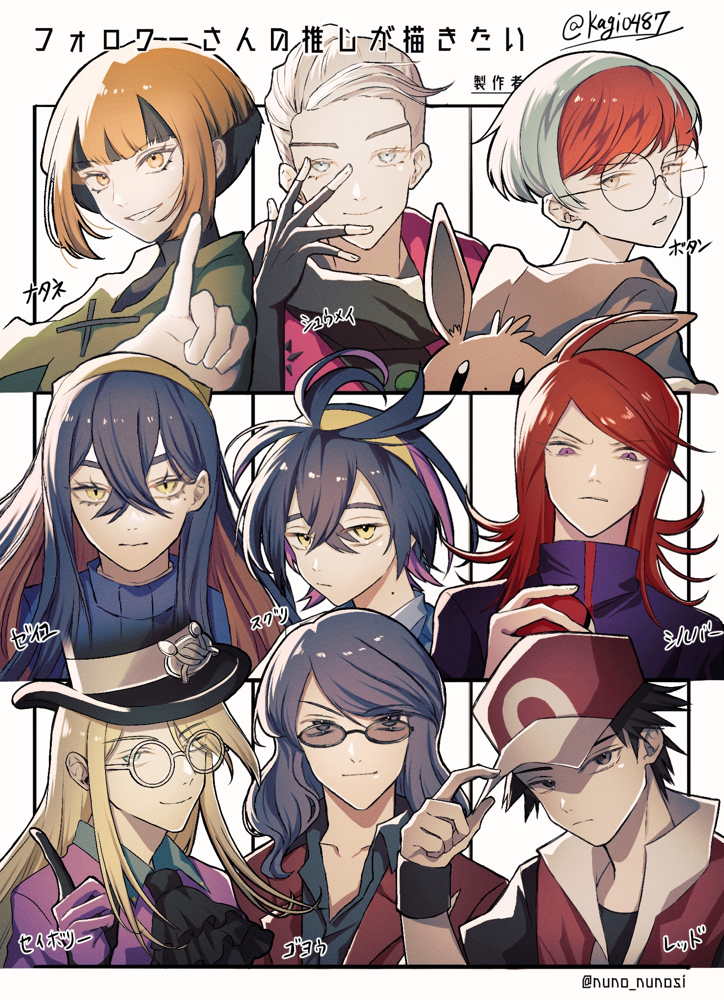 3girls 5boys atticus_(pokemon) avery_(pokemon) baseball_cap black-framed_eyewear black_gloves black_hair black_hat black_hoodie black_shirt blonde_hair blue_eyes blue_hair blue_jacket carmine_(pokemon) commentary_request cowlick expressionless fingerless_gloves followers_favorite_challenge gardenia_(pokemon) gloves grey_eyes grey_hair hairband hat highres holding holding_poke_ball hood hoodie jacket kagi0487_(weiss_9610) kieran_(pokemon) long_hair lucian_(pokemon) medium_hair mole mole_on_neck mole_under_eye multicolored_hair multiple_boys multiple_drawing_challenge multiple_girls nintendo orange_eyes orange_hair penny_(pokemon) poke_ball poke_ball_(basic) pokemon pokemon_diamond/pearl/platinum pokemon_firered_and_leafgreen pokemon_heartgold_and_soulsilver pokemon_scarlet_and_violet pokemon_sword_and_shield purple_eyes purple_hair red_(pokemon) red_hair red_hat red_vest round_eyewear shirt short_hair silver_(pokemon) smile twitter_username two-tone_hair vest wristband yellow_eyes yellow_hairband