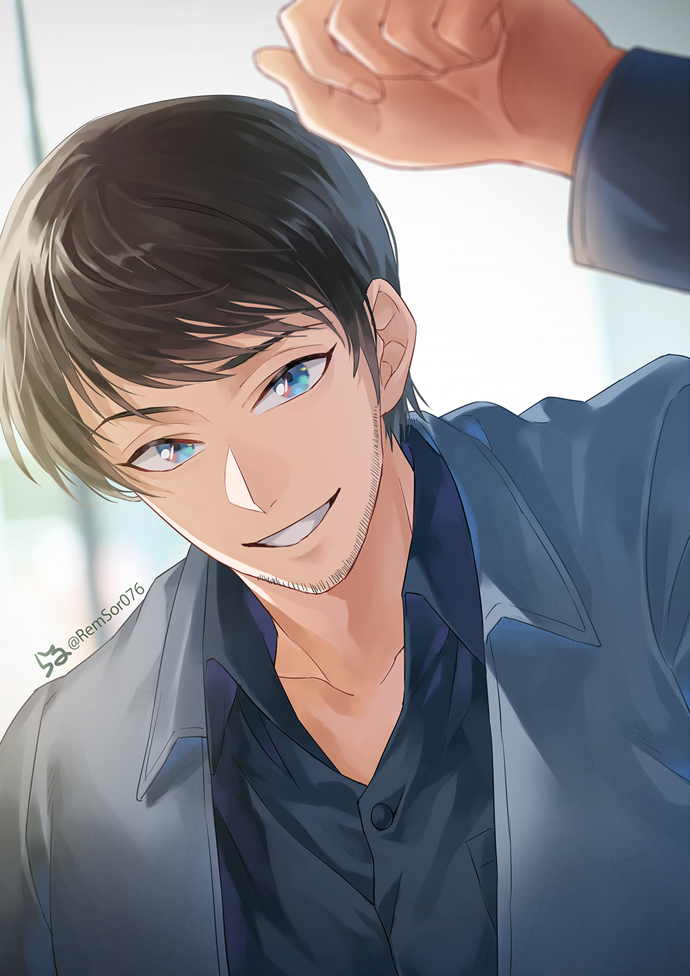 1boy beard_stubble blue_eyes blue_jacket brown_hair close-up collared_shirt commentary_request facial_hair highres jacket looking_at_viewer male_focus meitantei_conan raru_(remsor076) scotch_(meitantei_conan) shirt short_hair smile solo stubble swept_bangs twitter_username upper_body