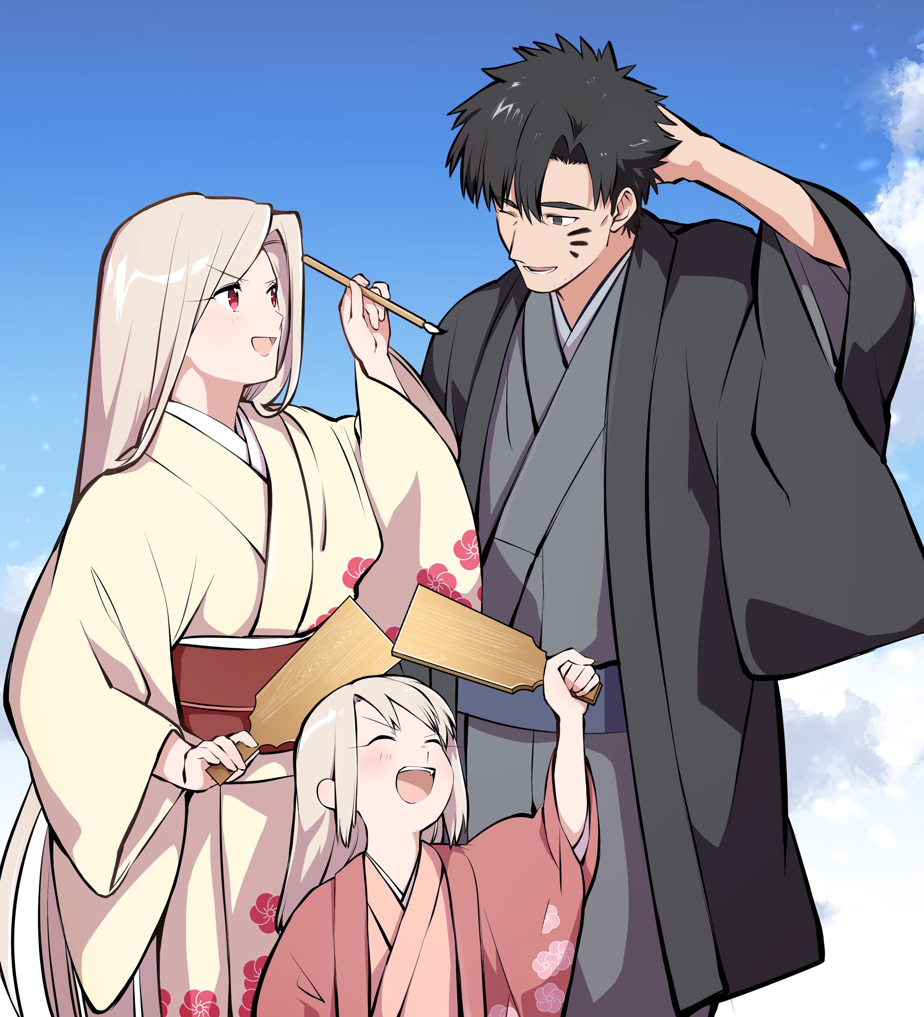 1boy 2girls alternate_costume black_eyes black_hair black_kimono blue_sky blush closed_eyes cloud commentary_request emiya_kiritsugu family fate/zero fate_(series) father_and_child father_and_daughter highres holding husband_and_wife illyasviel_von_einzbern irisviel_von_einzbern japanese_clothes kimono long_hair looking_at_another looking_to_the_side mother_and_child mother_and_daughter multiple_girls obi one_eye_closed open_mouth outdoors parent_and_child pointy_hair red_eyes sash sky smile very_long_hair white_hair wide_sleeves yuuma_(u-ma)