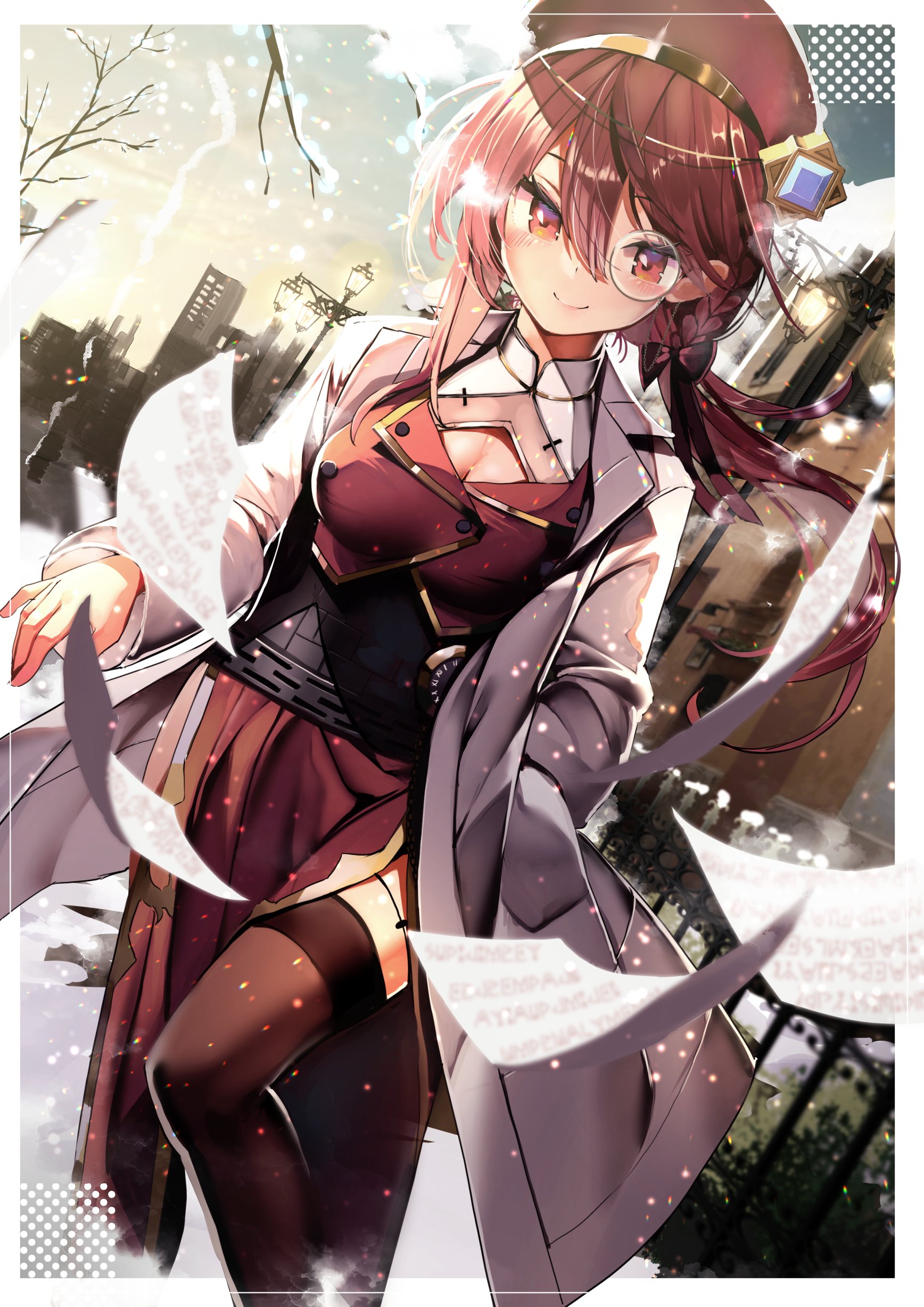 1girl absurdres black_bow black_thighhighs blush bow breasts cleavage cleavage_cutout closed_mouth clothing_cutout coat commentary_request commission dress falling_paper hair_bow hair_ornament haruhina_purple hat hat_ornament highres long_hair long_sleeves looking_at_viewer low_ponytail medium_breasts mist_train_girls monocle open_clothes open_coat orange_eyes outdoors pehjing_(mist_train_girls) ponytail red_dress red_hair red_hat side_slit skeb_commission snow solo thighhighs white_coat