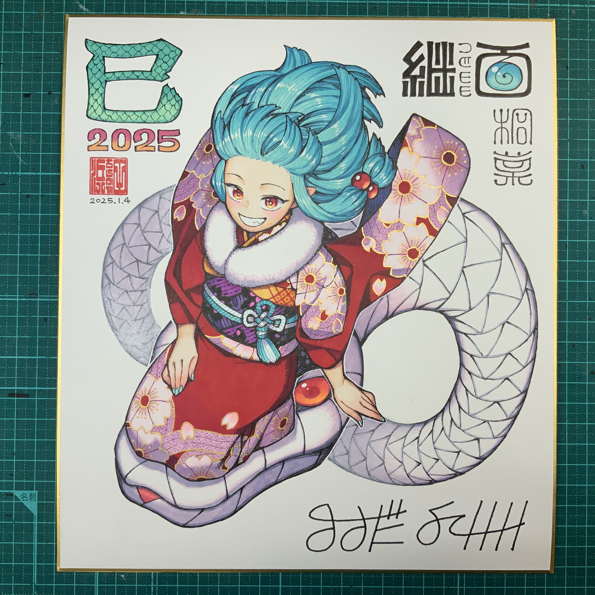 1girl 2025 blue_hair chinese_zodiac commentary_request floral_print floral_print_kimono fur_collar grin hair_bobbles hair_ornament hamada_yoshikazu highres japanese_clothes kimono kiriha_(tsugumomo) long_hair long_sleeves looking_at_viewer obi photo_(medium) pointy_ears print_kimono red_eyes revision sash seiza shikishi signature simple_background sitting smile snake solo traditional_media tsugumomo white_background white_snake wide_sleeves year_of_the_snake