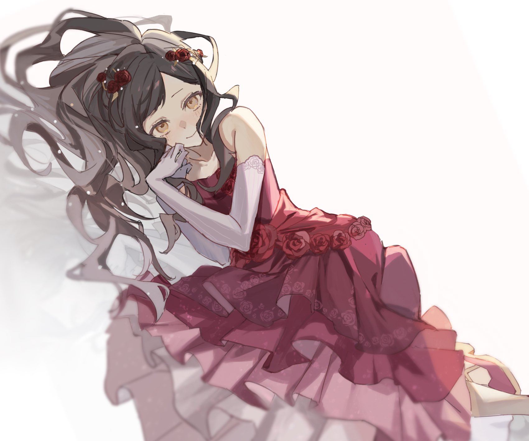 1girl aozora_ni_negau_your_happiness!_(project_sekai) bad_id bad_twitter_id bare_shoulders black_hair commentary dress elbow_gloves flower gloves hair_flower hair_ornament hair_spread_out hands_up highres inactive_account long_hair looking_at_viewer lying nanashiro_(7_shiro_) official_alternate_costume on_side own_hands_together project_sekai red_dress red_flower red_rose rose shiraishi_an smile solo strapless strapless_dress untranslatable_commentary white_background white_gloves yellow_eyes