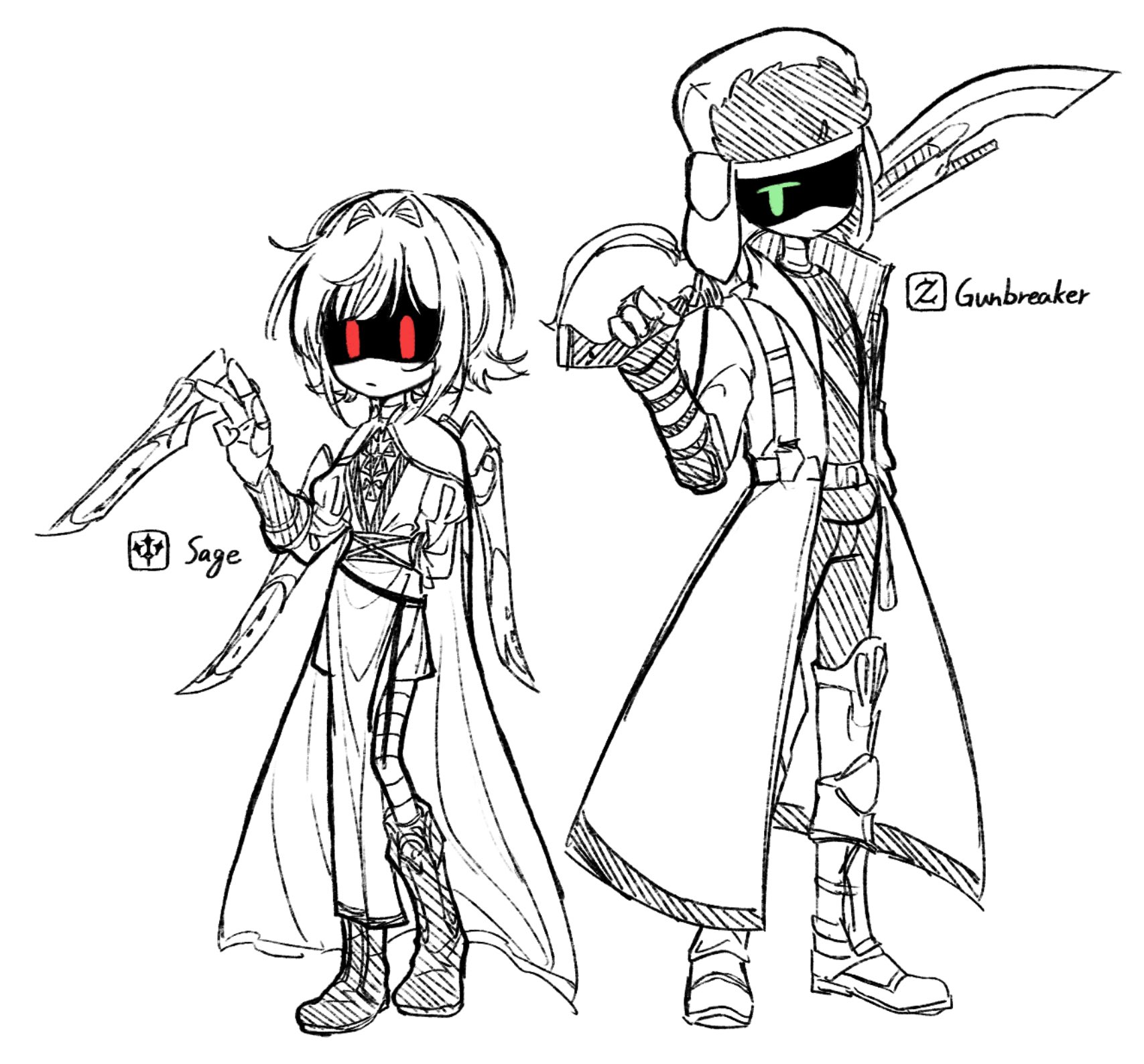 aida_(aidacamelia0516) boots closed_mouth coat doll's_father_(murder_drones) dress english_text final_fantasy final_fantasy_xiv full_body green_eyes greyscale hand_up hat highres holding holding_sword holding_weapon looking_at_viewer monochrome murder_drones neon_lights red_eyes short_hair sweater sword ushanka weapon yeva_(murder_drones)