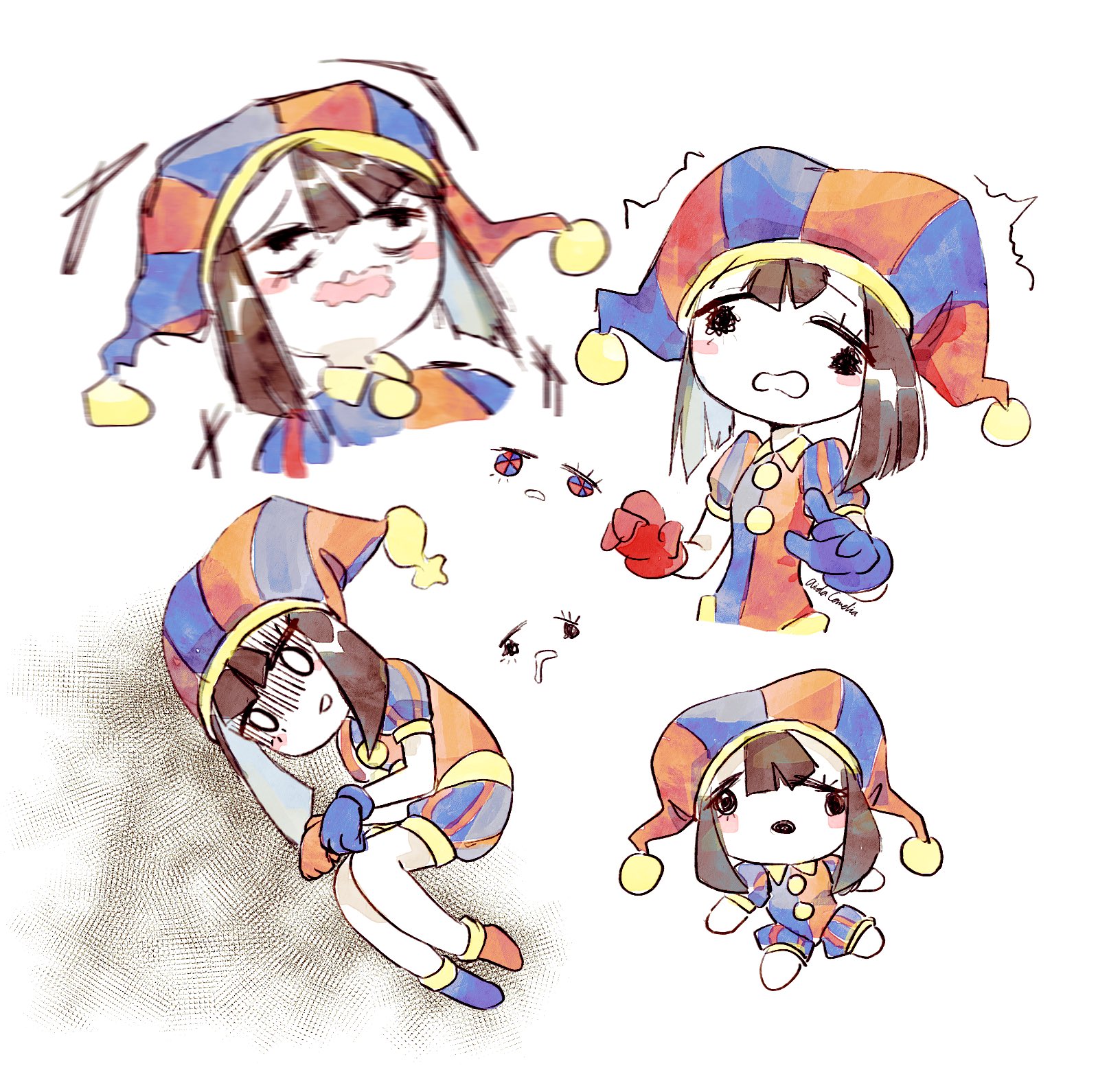 1girl aida_(aidacamelia0516) asymmetrical_gloves black_eyes blue_gloves bocchi_the_rock! brown_hair gloves hands_up hat highres jester_cap lying mismatched_gloves multiple_views on_side open_mouth parody pomni_(the_amazing_digital_circus) red_gloves red_shirt shaking shirt short_hair simple_background squiggle_eyes striped_clothes striped_hat striped_shirt the_amazing_digital_circus white_background