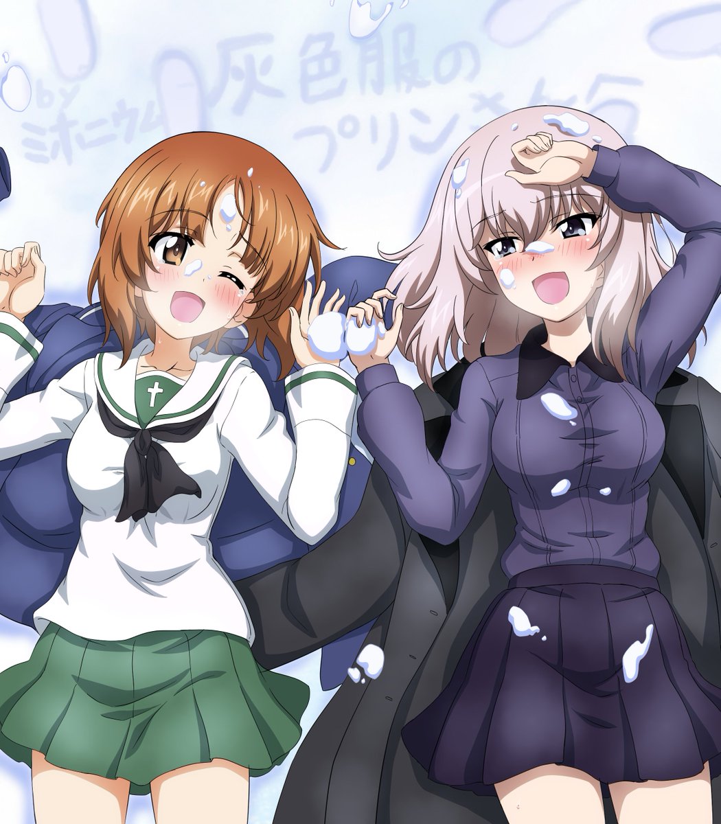 2girls alternate_universe black_coat black_eyes black_scarf black_skirt blue_jacket brown_eyes brown_hair coat collarbone collared_shirt girls_und_panzer green_skirt grey_hair grey_shirt highres itsumi_erika jacket key_(gaigaigai123) kuromorimine_school_uniform lying medium_hair miniskirt multiple_girls nishizumi_miho on_back on_ground one_eye_closed ooarai_school_uniform scarf school_uniform serafuku shirt short_hair skirt snow snowball snowball_fight white_serafuku yuri