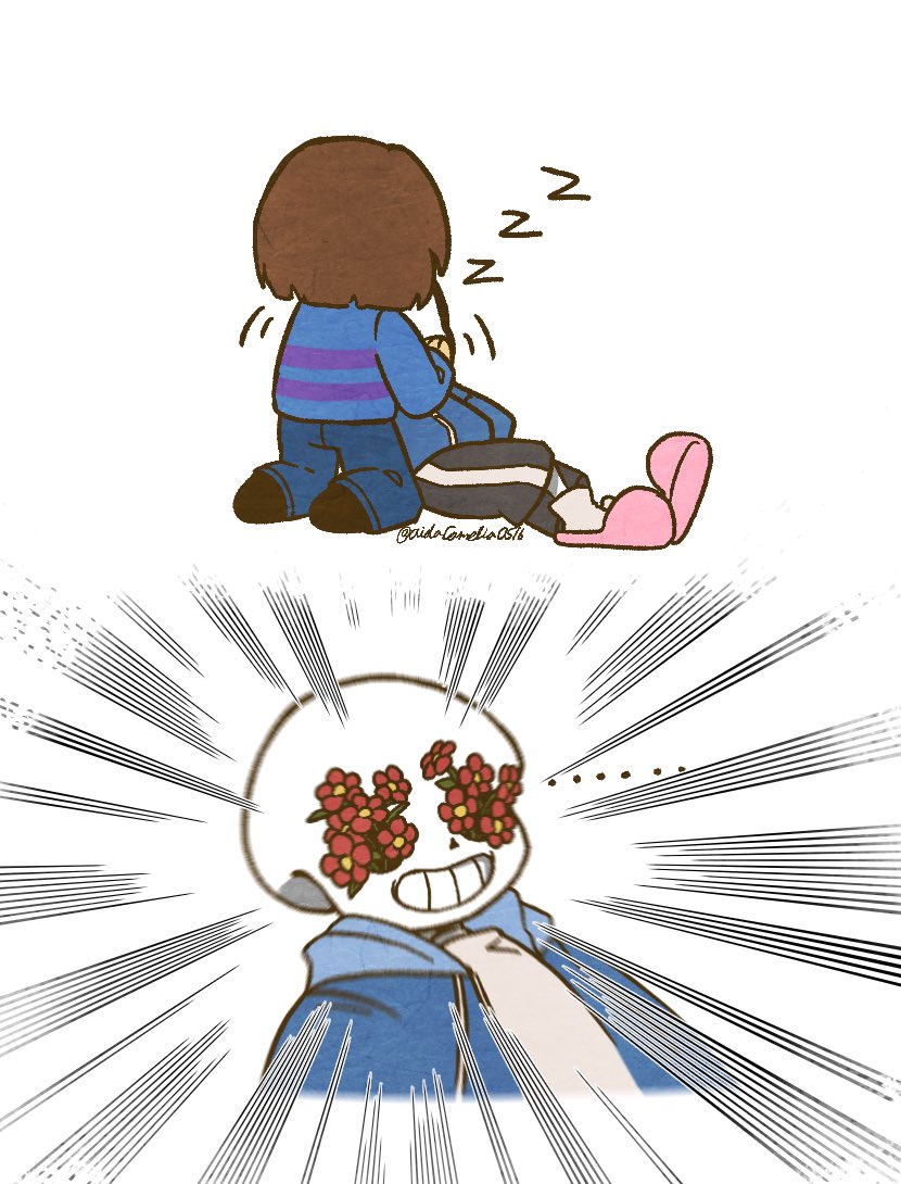 1boy 1other aida_(aidacamelia0516) black_shorts blue_jacket blue_pants brown_hair flower frisk_(undertale) jacket kneeling long_sleeves pants pink_slippers red_flower sans_(undertale) shirt short_hair shorts simple_background skeleton slippers undertale utdr_(toby_fox) white_background white_shirt zzz