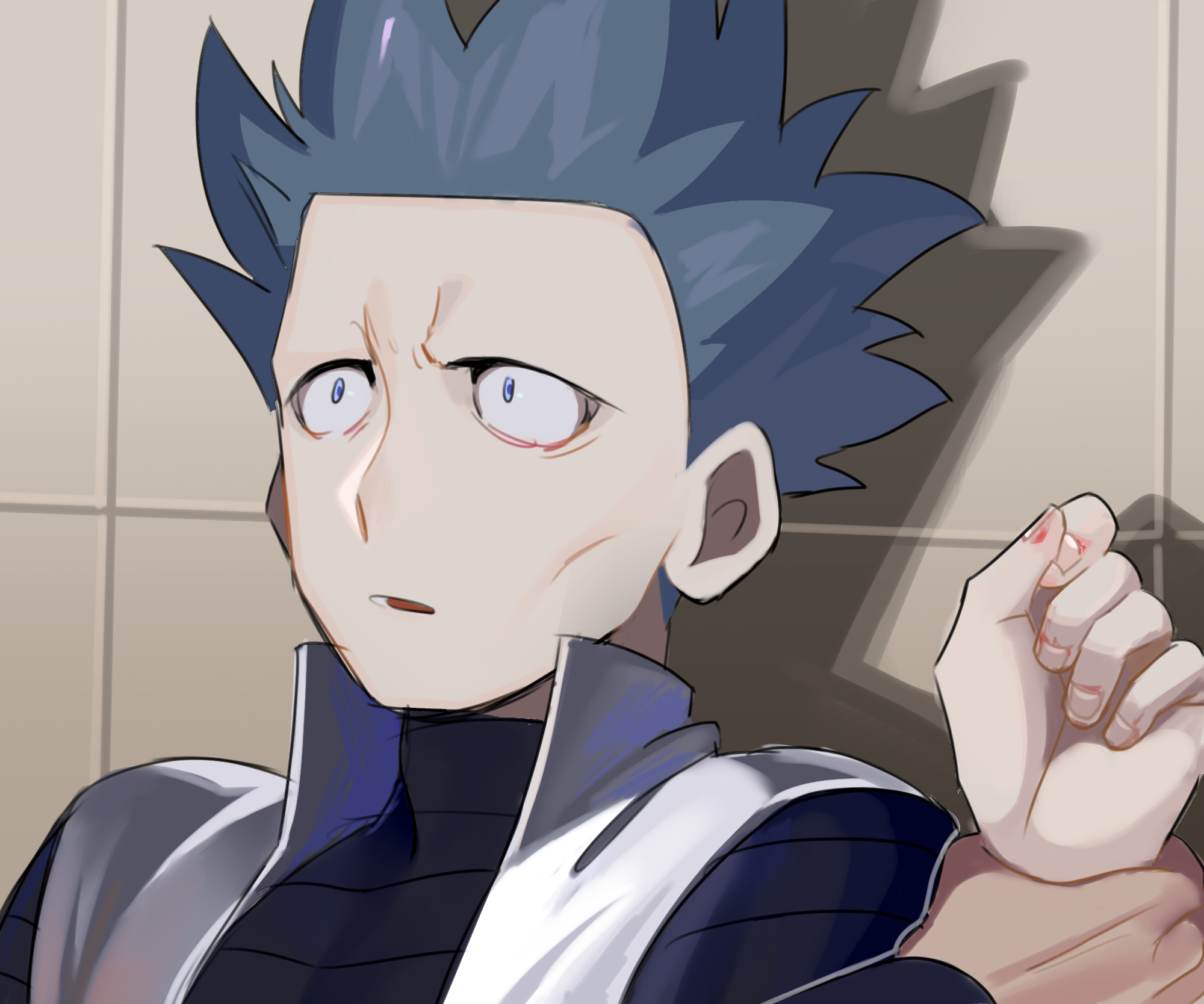 2boys =_(9_yawbus) black_shirt blue_eyes commentary_request constricted_pupils cyrus_(pokemon) grey_hair hand_up highres holding_another's_wrist long_sleeves looking_up male_focus multiple_boys nintendo open_clothes open_mouth open_vest pokemon pokemon_diamond/pearl/platinum popped_collar ribbed_shirt shirt short_hair tile_wall tiles vest