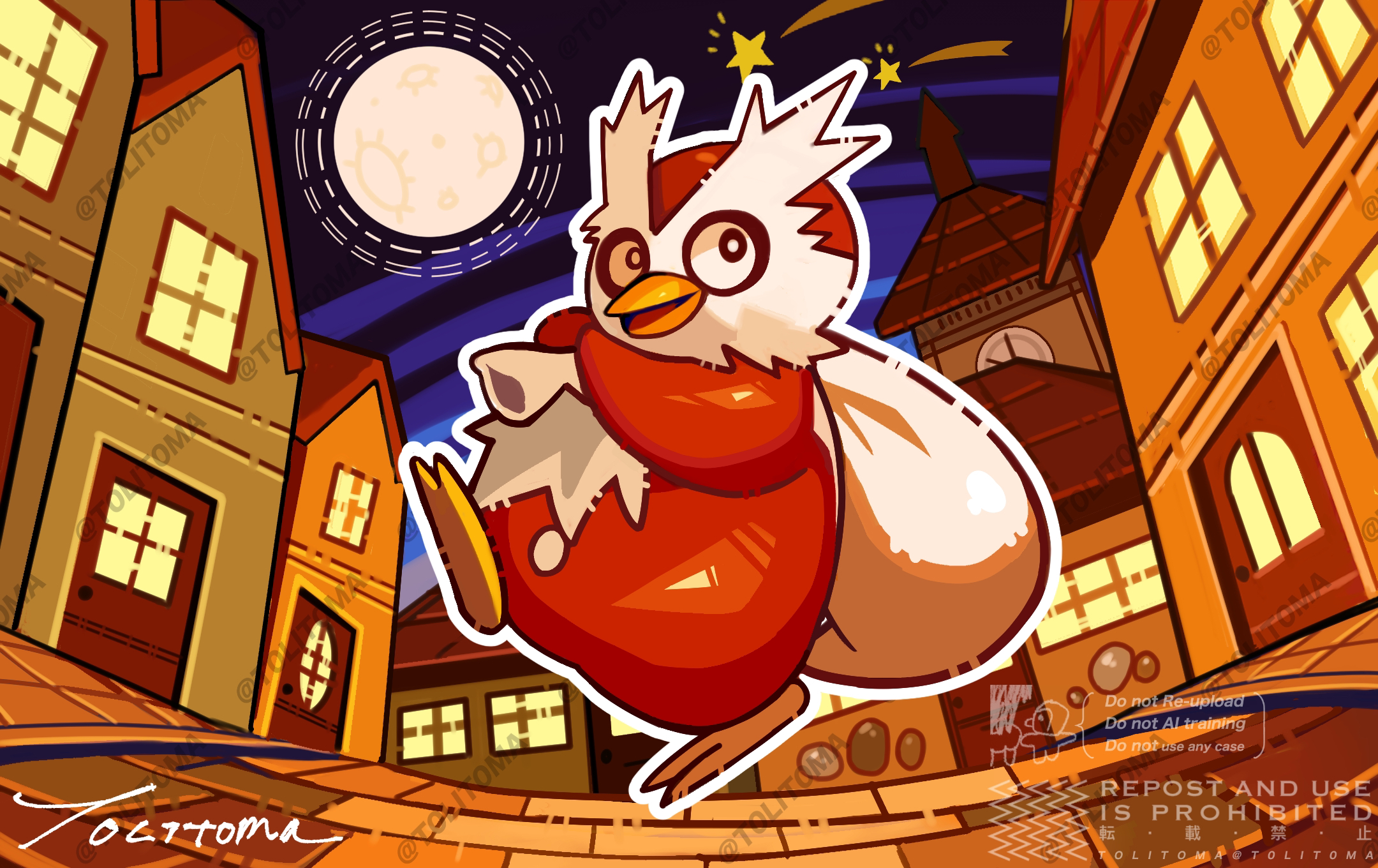 =_(9_yawbus) bright_pupils building commentary_request delibird gen_2_pokemon highres holding holding_sack moon night nintendo no_humans open_mouth outdoors outline pokemon pokemon_(creature) sack shooting_star signature sky solo watermark