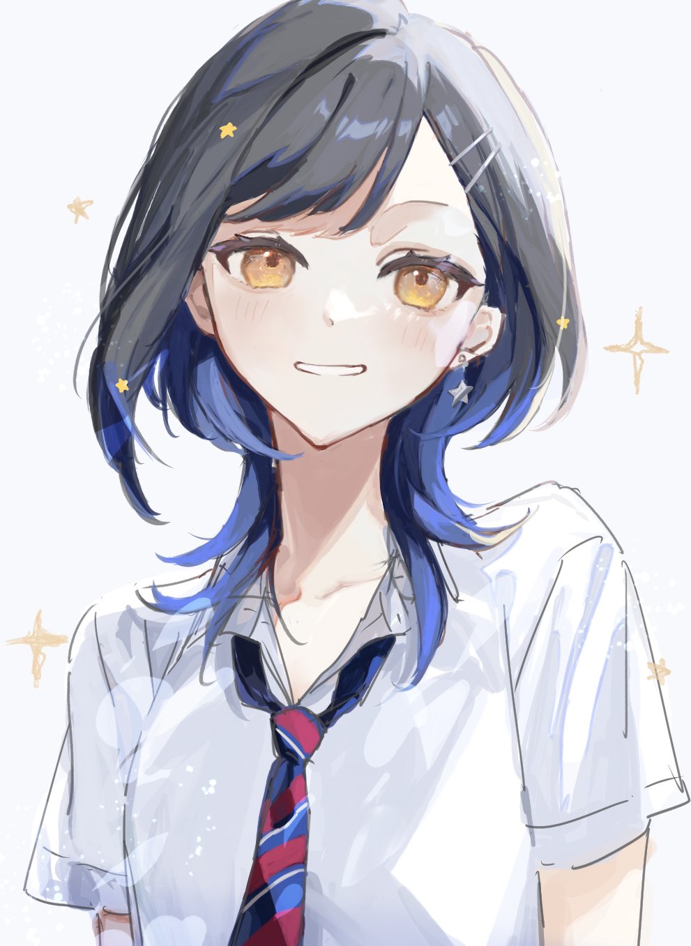 1girl alternate_hair_length alternate_hairstyle bad_id bad_twitter_id black_hair blue_hair brown_eyes collared_shirt commentary_request earrings hair_ornament hairclip highres inactive_account jewelry looking_at_viewer multicolored_hair nanashiro_(7_shiro_) necktie open_mouth project_sekai shiraishi_an shirt short_hair short_sleeves simple_background smile solo sparkle striped_clothes striped_necktie upper_body white_background white_shirt wolf_cut