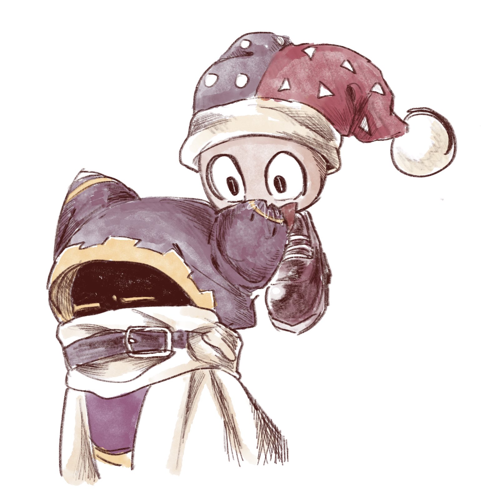 aida_(aidacamelia0516) belt biting black_belt blue_hood brown_footwear cloak floating hat highres jester_cap kirby_(series) magolor marx_(kirby) nintendo no_humans saliva simple_background white_background white_cloak