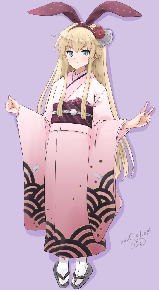 1girl blonde_hair blue_eyes flower full_body hair_flower hair_ornament hairband haregi japanese_clothes kantai_collection kimono kitagawa_mikio long_hair long_sleeves okobo pink_hairband pink_kimono platform_sandals purple_background sandals shimakaze_(kancolle) shimakaze_(new_year)_(kancolle) sidelocks simple_background smile socks solo tabi v white_socks