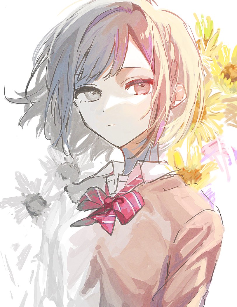 1girl bad_id bad_twitter_id bow bowtie brown_eyes brown_hair brown_sweater closed_mouth collared_shirt expressionless floral_background flower looking_at_viewer nanashiro_(7_shiro_) project_sekai red_bow red_bowtie school_uniform shinonome_ena shirt short_hair solo sweater upper_body white_background white_shirt yellow_flower
