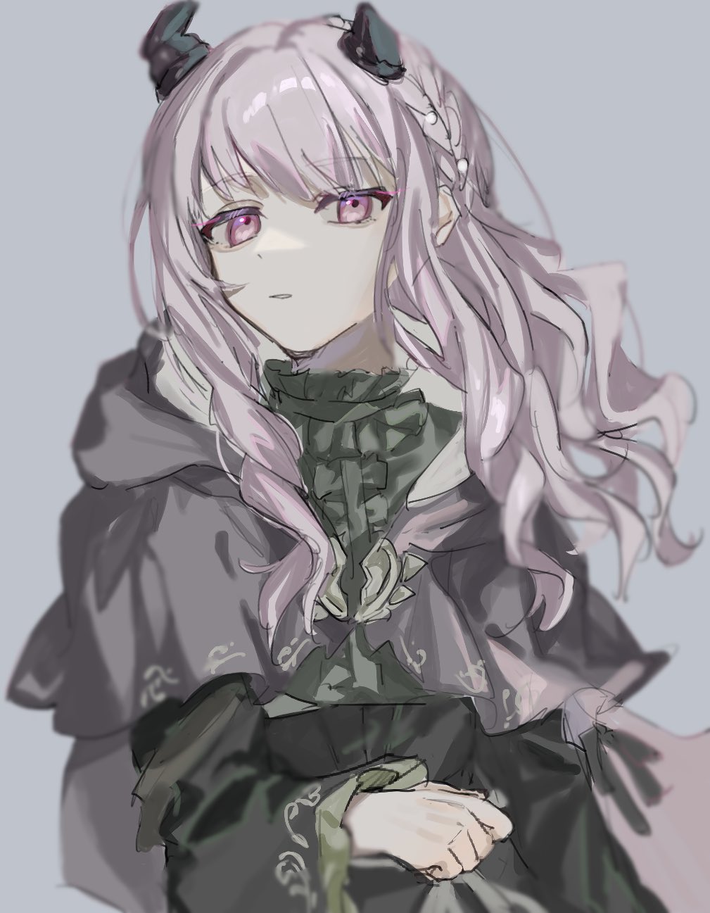 1other akiyama_mizuki bad_id bad_twitter_id black_capelet black_horns black_shirt boku_no_ashiato_kimi_no_yukusaki_(project_sekai) broken_horn capelet center_frills frills grey_background highres hood hood_down hooded_capelet horns inactive_account long_hair long_sleeves looking_at_viewer nanashiro_(7_shiro_) official_alternate_costume other_focus parted_lips pink_eyes pink_hair project_sekai shirt simple_background solo upper_body wavy_hair