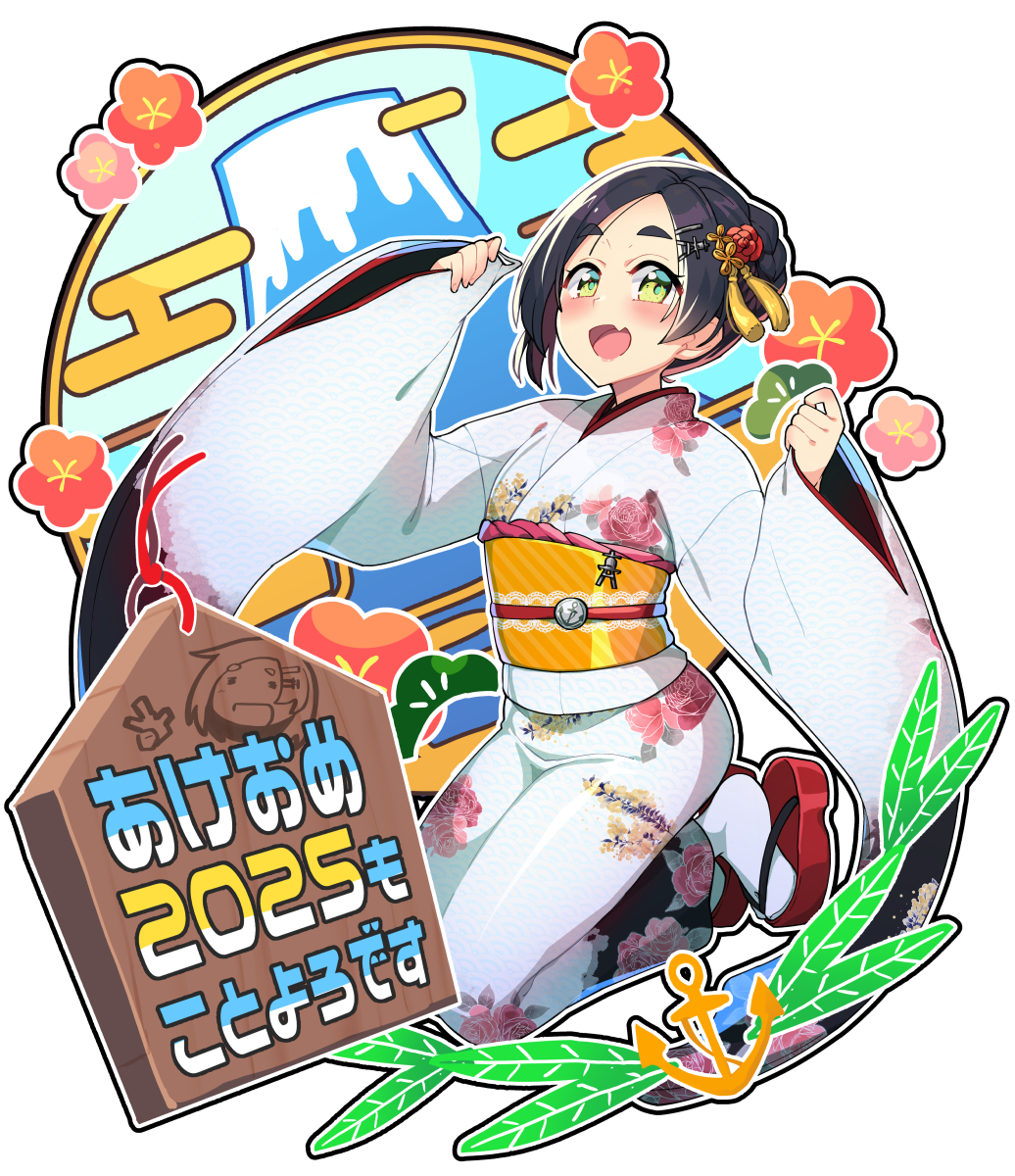 1girl black_hair fang floral_print floral_print_kimono hair_bun hair_ornament hairclip highres japanese_clothes kantai_collection kimono kuroshio_(kancolle) obi open_mouth print_kimono sandals sash short_hair skin_fang solo tabi taketora_suzume white_kimono wide_sleeves zouri