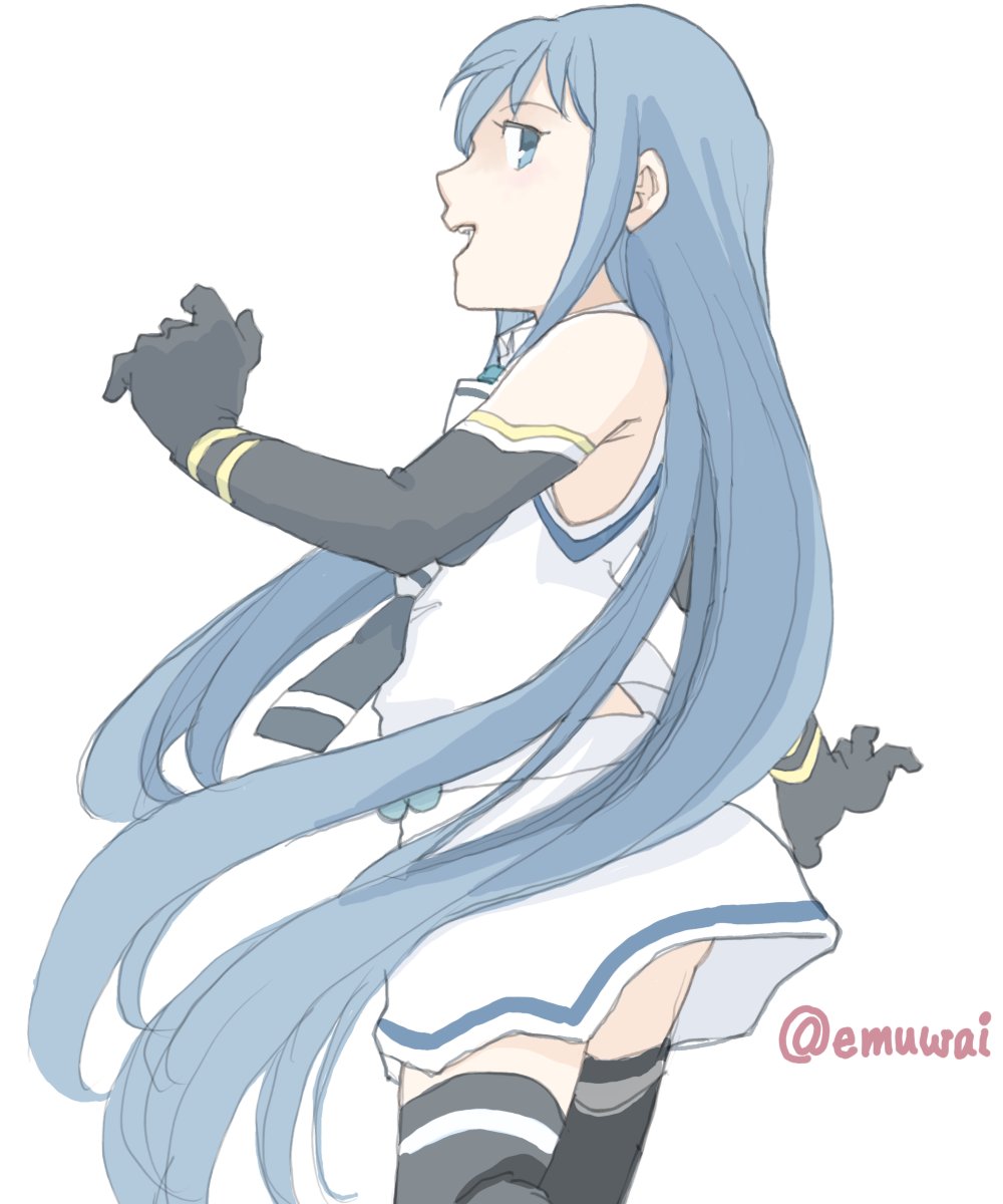 1girl black_neckerchief black_sailor_collar black_thighhighs blue_eyes blue_hair elbow_gloves emuwai from_behind gloves highres kantai_collection long_hair neckerchief one-hour_drawing_challenge sailor_collar samidare_(kancolle) school_uniform serafuku shirt simple_background skirt sleeveless sleeveless_shirt solo swept_bangs thighhighs twitter_username very_long_hair white_background white_shirt white_skirt