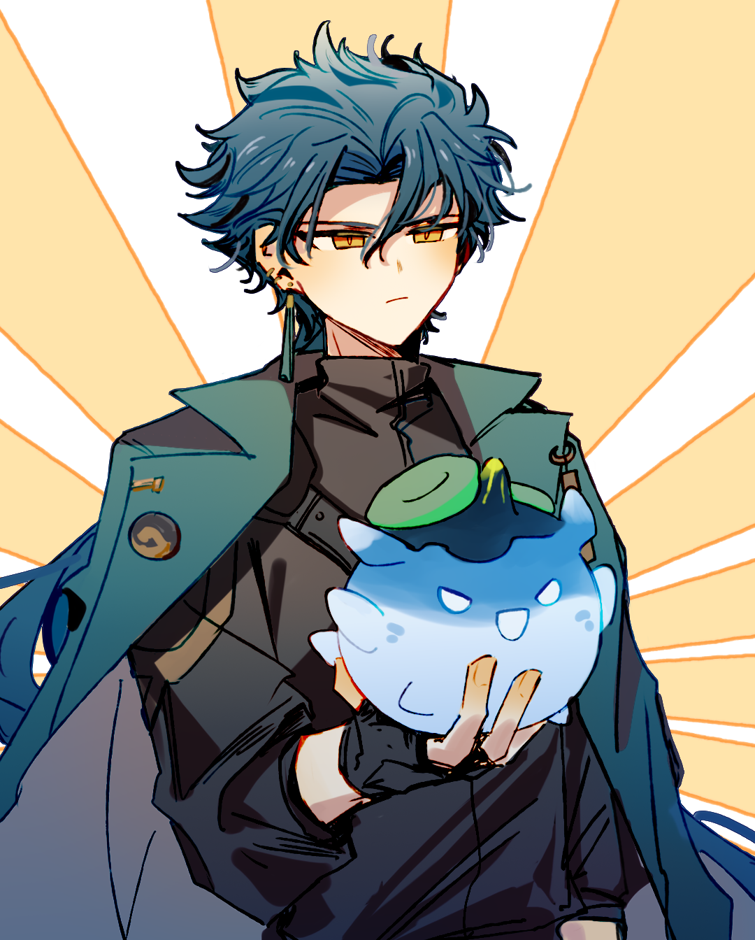 1boy black_gloves black_shirt chinese_commentary closed_mouth commentary_request fingerless_gloves gloves green_hair green_jacket highres holding jacket jacket_on_shoulders jiyan_(wuthering_waves) long_hair male_focus official_alternate_costume shirt solo tacet_discord_(wuthering_waves) tincture upper_body very_long_hair wuthering_waves yellow_eyes