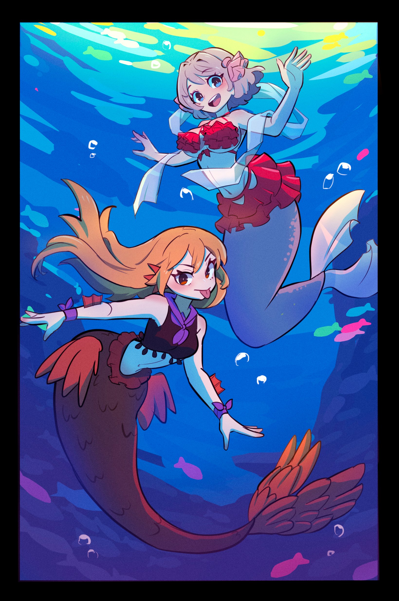 2girls absurdres amazu_(kurozu) bikini blonde_hair blue_eyes bubble commission crop_top grey_hair highres isla_(cophocoa) long_hair looking_at_viewer mermaid monster_girl multiple_girls navel open_mouth original red_bikini red_eyes ribbon sailor_collar sash short_hair swimsuit tongue tongue_out underwater wrist_ribbon