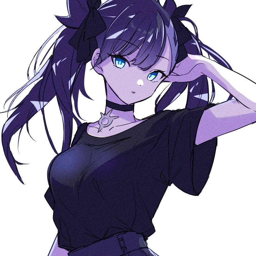 1girl black_choker black_hair black_ribbon black_shirt blue_eyes choker hair_ribbon hand_in_own_hair looking_at_viewer marie_(pixiv59672544) marnie_(pokemon) nintendo pokemon pokemon_sword_and_shield ribbon shirt simple_background solo twintails white_background