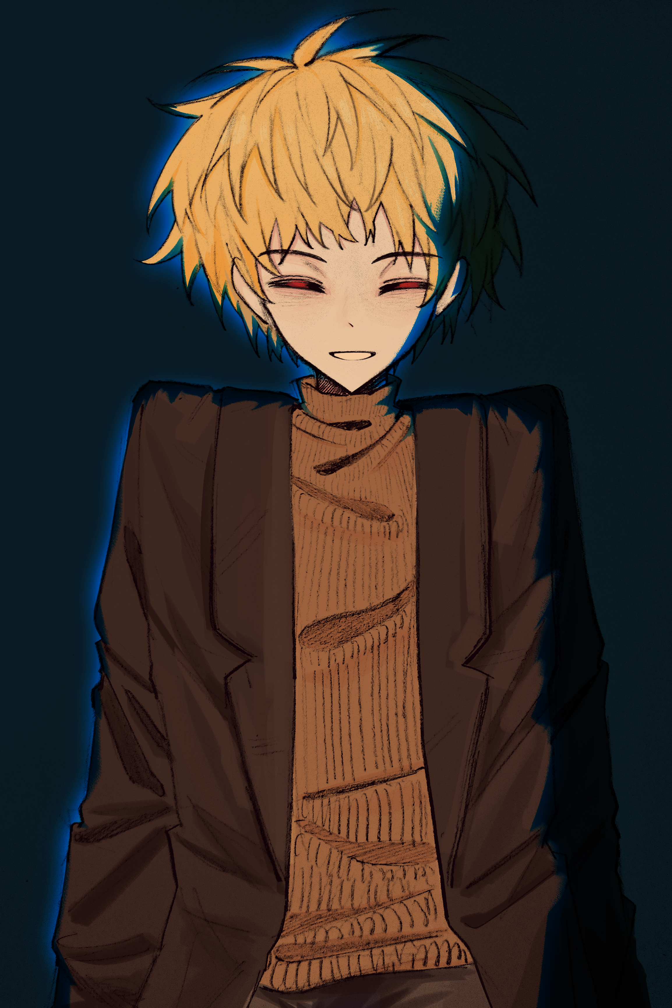 1boy absurdres atou_haruki black_jacket blonde_hair brown_sweater chikana. chinese_commentary closed_eyes commentary_request facing_viewer green_background grey_pants grin highres jacket lapels long_sleeves male_focus notched_lapels open_clothes open_jacket pants ribbed_sweater saibou_shinkyoku short_hair simple_background smile solo sweater turtleneck turtleneck_sweater upper_body variant_set