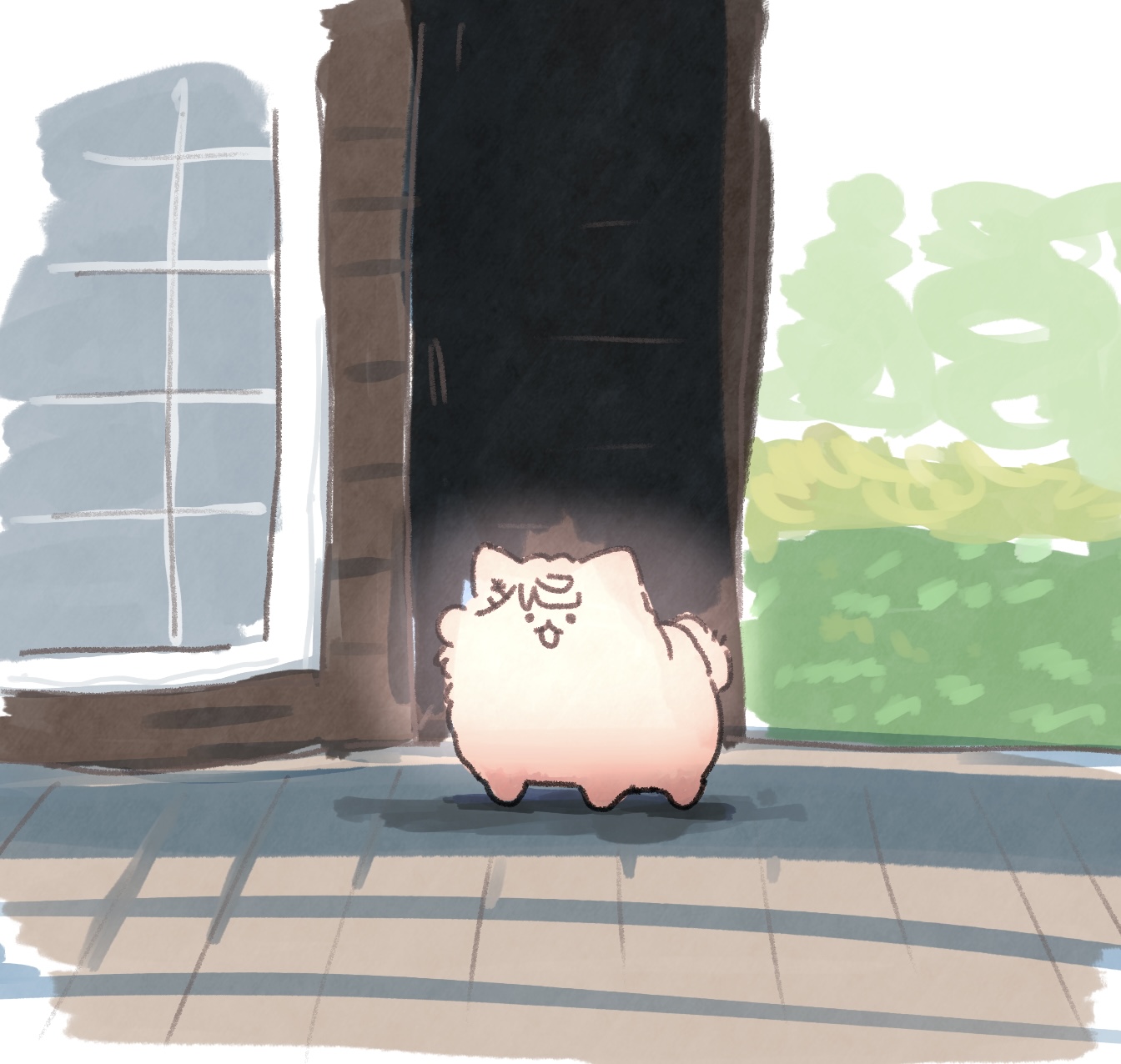 :< animal animalization ao_kaeru commentary_request dog glowing hair_bun highres love_live! love_live!_nijigasaki_high_school_idol_club no_humans open_mouth outdoors pomeranian_(dog) single_side_bun sketch_background solo standing uehara_ayumu