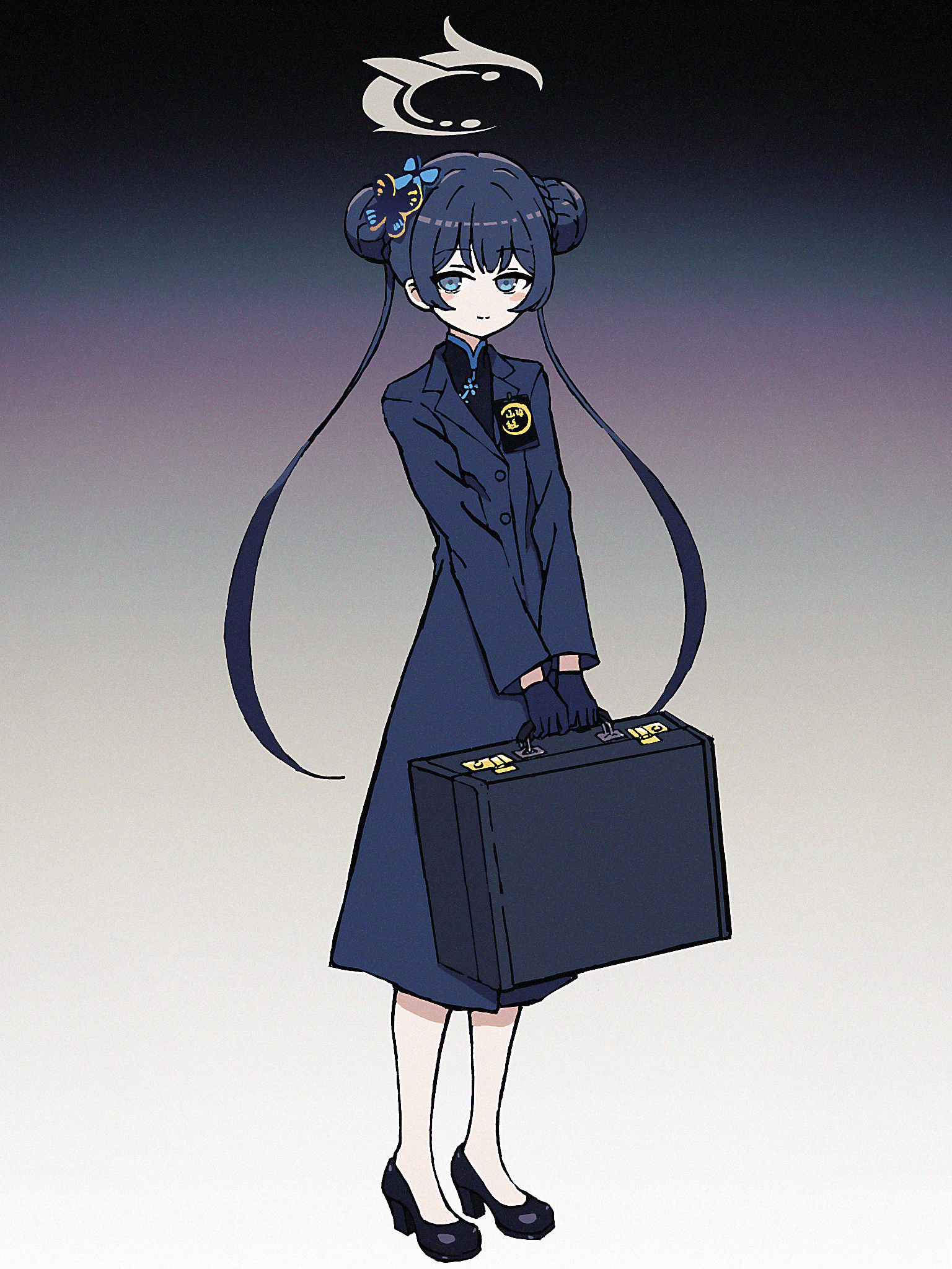 1girl black_background black_coat black_dress black_footwear black_gloves black_hair blue_archive blue_eyes blush braid braided_bun butterfly_hair_ornament china_dress chinese_clothes closed_mouth coat double_bun dress full_body gloves gradient_background hair_bun hair_ornament halo high_heels highres holding holding_suitcase id_card jacket kisaki_(blue_archive) long_coat long_hair long_sleeves looking_at_viewer nkymyura own_hands_together smile solo standing suit_jacket suitcase twintails very_long_hair white_background
