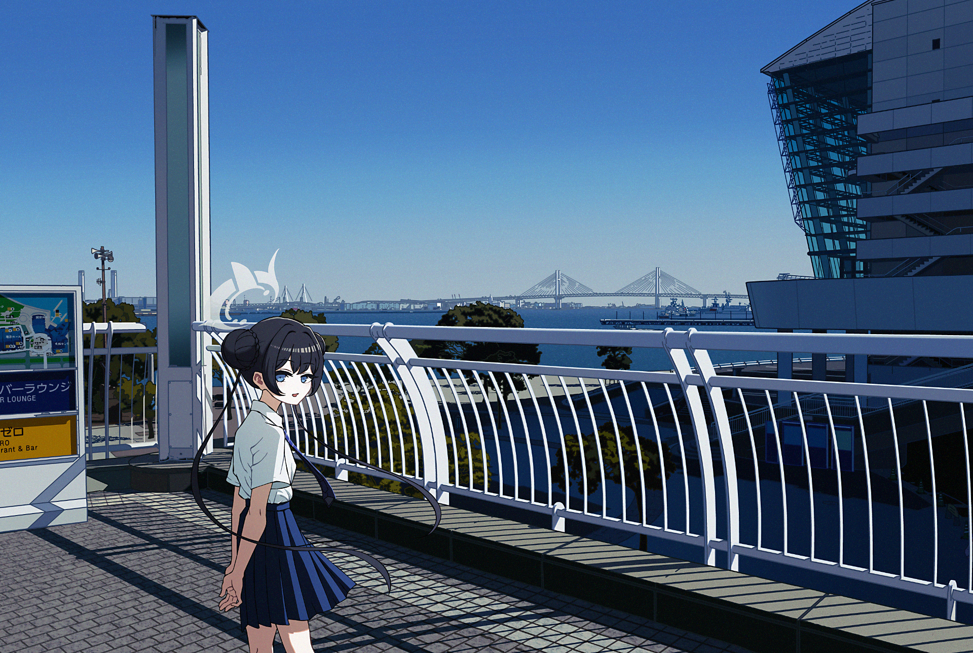 1girl :d arms_behind_back black_hair blue_archive blue_eyes blue_necktie blue_skirt blue_sky braid braided_bun brick_floor bridge building clear_sky collared_shirt cowboy_shot day double_bun floating_hair from_side hair_bun halo high-waist_skirt highres kisaki_(blue_archive) kisaki_(school_uniform)_(blue_archive) legs_apart long_hair miniskirt necktie nkymyura open_mouth outdoors own_hands_clasped own_hands_together pleated_skirt railing river school_uniform shadow shirt short_sleeves sign skirt sky skyline smile solo twintails white_shirt