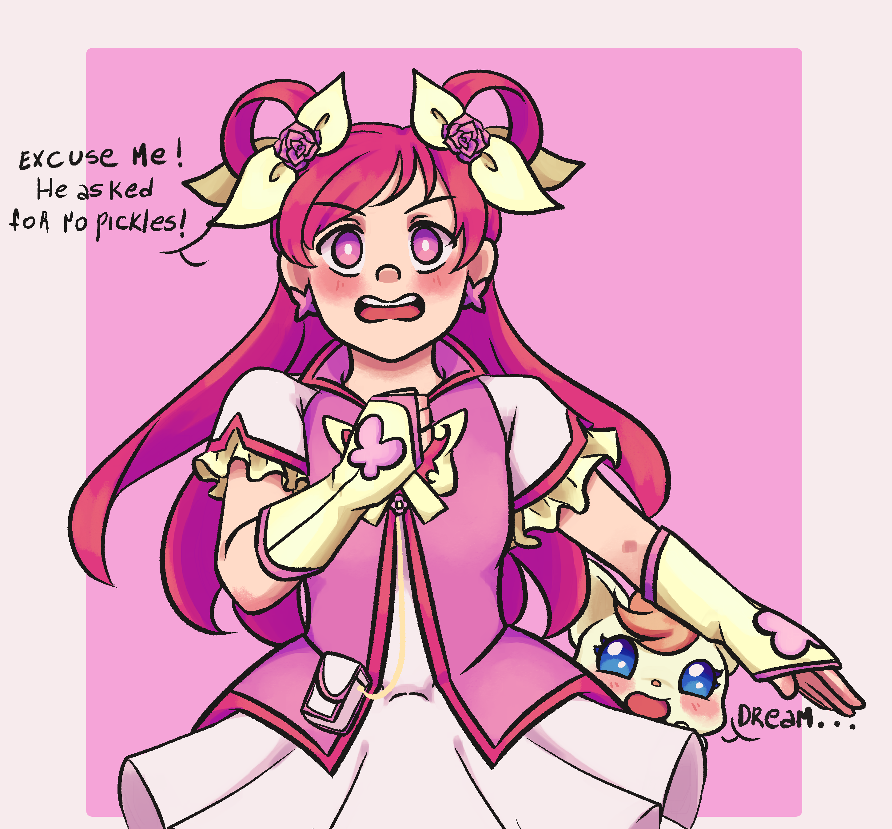 1boy 1girl absurdres blush brooch butterfly_brooch butterfly_earrings coco_(precure) cure_dream dress earrings english_text fairy fingerless_gloves flower fox gloves hair_flower hair_ornament hair_ribbon hair_rings highres jewelry long_hair magical_girl open_mouth pandaacolor pink_eyes pink_hair pink_vest precure puffy_short_sleeves puffy_sleeves ribbon short_sleeves two-tone_gloves vest white_dress yellow_ribbon yes!_precure_5 yes!_precure_5_gogo! yumehara_nozomi