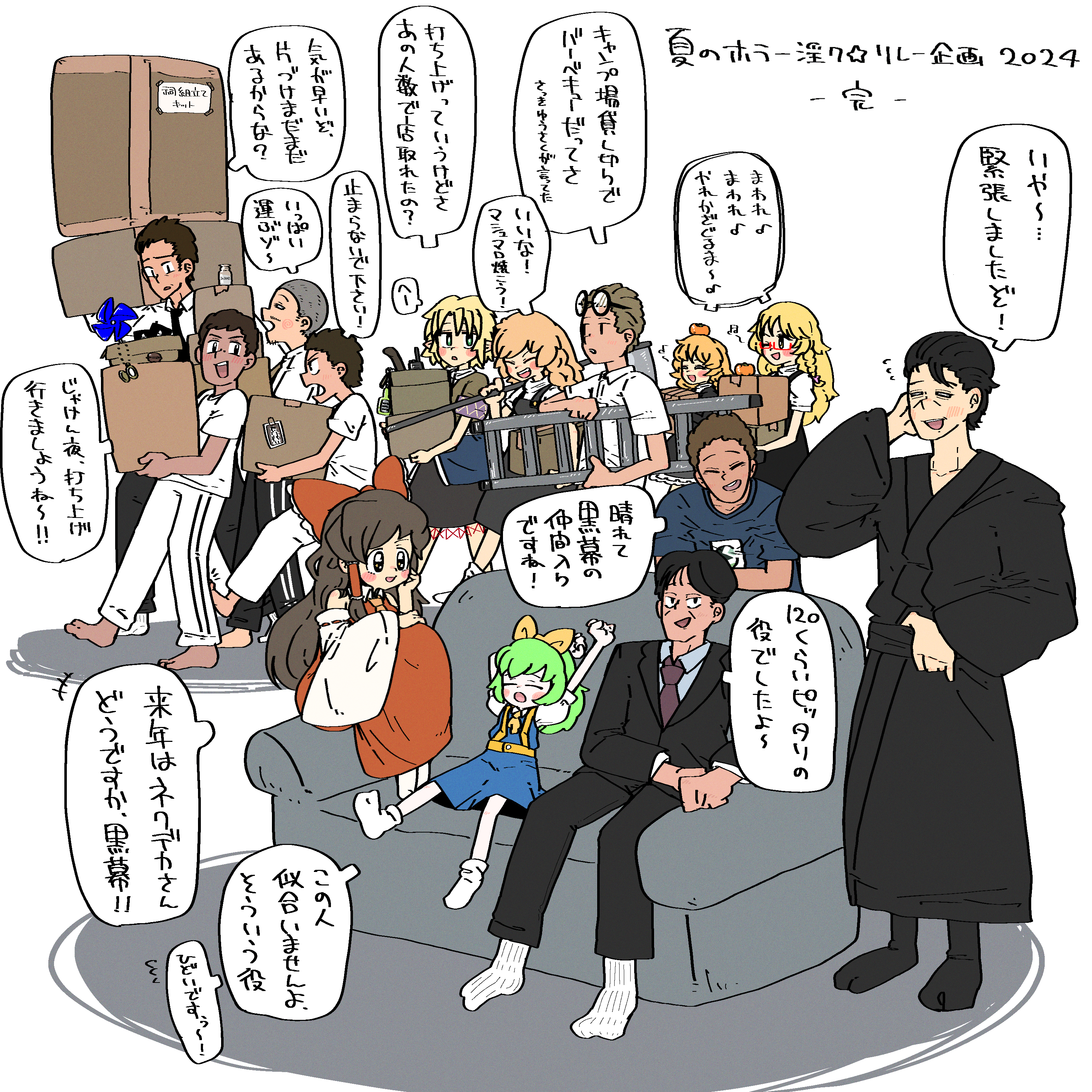 6+boys 6+girls absurdres akiyoshi_(inmu) barefoot black-framed_eyewear black_hair black_kimono black_pants black_socks blonde_hair blue_dress blue_shirt blush border bow box braid brown_necktie closed_eyes collared_shirt commentary_request cookie_(touhou) couch daiyousei detached_sleeves diyusi_(cookie) dress eyewear_on_head food formal_clothes frilled_hair_tubes frills fruit full_body glasses green_eyes grey_shirt hair_bow hair_tubes hakurei_reimu high-visibility_clothing high-visibility_vest highres hirano_gengorou holding holding_box holding_ladder japanese_clothes joker_(cookie) kimono kimura_(coat_corp.) kirisame_marisa ladder long_hair looking_at_another looking_to_the_side manatsu_no_yo_no_inmu mandarin_orange miura_daisenpai mizuhashi_parsee muimui_(4242564muimui) multiple_boys multiple_girls necktie necktie_dekasugi niconico_id no_shoes noel_(cookie) on_couch one_eye_closed open_mouth pants pinafore_dress pinwheel red-framed_eyewear red_bow rei_(cookie) shirt short_hair side_braid simple_background single_braid sitting sleeveless sleeveless_dress smile socks standing suit suzu_(cookie) toono_(coat) touhou translation_request uzuki_(cookie) walking white_background white_border white_pants white_shirt yajuu_senpai