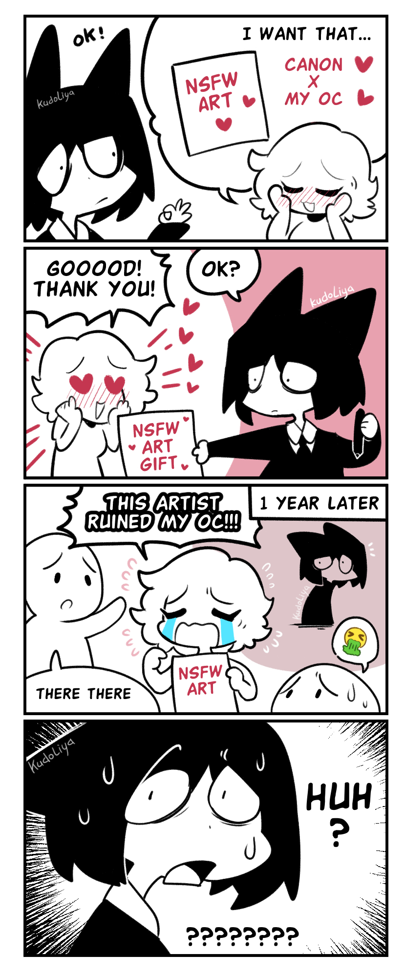 2girls 2others 4koma artist_name blush border comic crying emoji english_text flying_sweatdrops hair_ears hands_on_own_face heart heart-shaped_eyes highres holding kudoliya_art multiple_girls multiple_others nervous_sweating open_mouth original partially_colored speech_bubble streaming_tears sweat tears