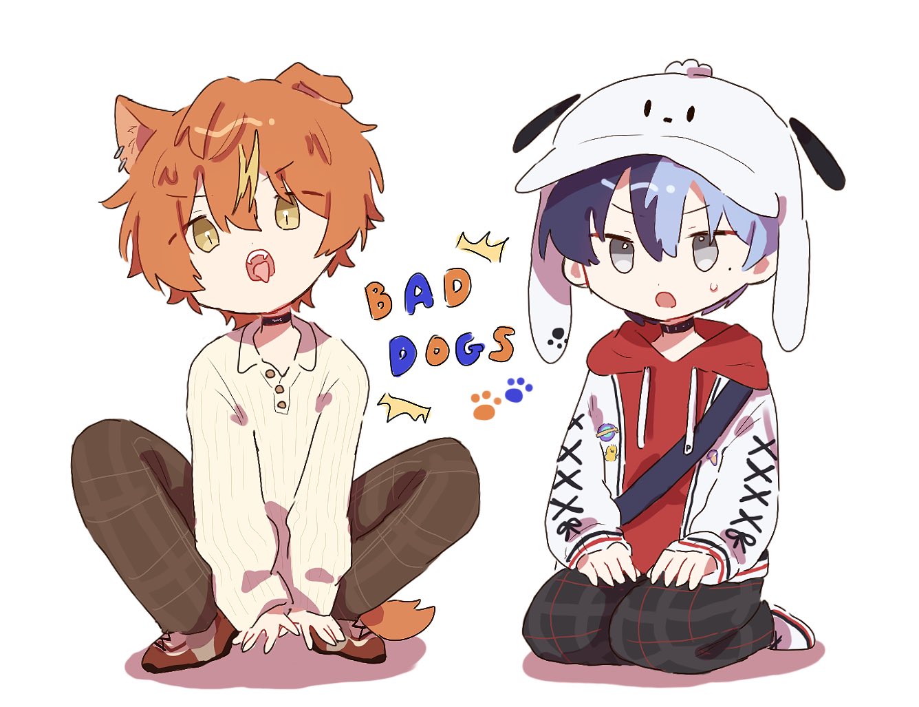 2boys animal_ears aoyagi_touya black_choker blonde_hair blue_hair buttons choker collared_shirt commentary_request dark_blue_hair dog_ears drawstring full_body grey_hair hands_on_own_thighs hat hood hood_down hoodie jacket long_sleeves male_focus mole mole_under_eye multicolored_hair multiple_boys official_alternate_costume official_alternate_hairstyle open_clothes open_jacket open_mouth orange_hair pants paw_print plaid_clothes plaid_pants project_sekai red_hoodie riaru rise_as_one!_(project_sekai) shinonome_akito shirt short_hair simple_background split-color_hair tail teeth tongue tongue_out two-tone_hair upper_teeth_only white_background white_hat white_jacket