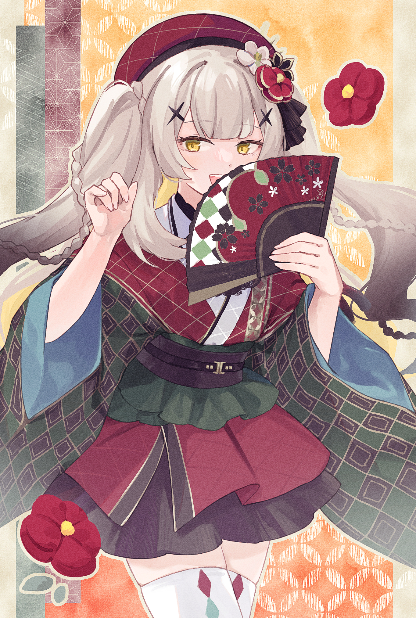 1girl beret braid commentary fate/grand_order fate_(series) flower folding_fan grey_hair hair_flower hair_ornament hand_fan hat highres japanese_clothes kimono kotake_8 long_hair marie_antoinette_(fate) marie_antoinette_alter_(fate) marie_antoinette_alter_(kyomaf_2024)_(fate) short_kimono thighhighs twintails white_thighhighs wide_sleeves yellow_eyes