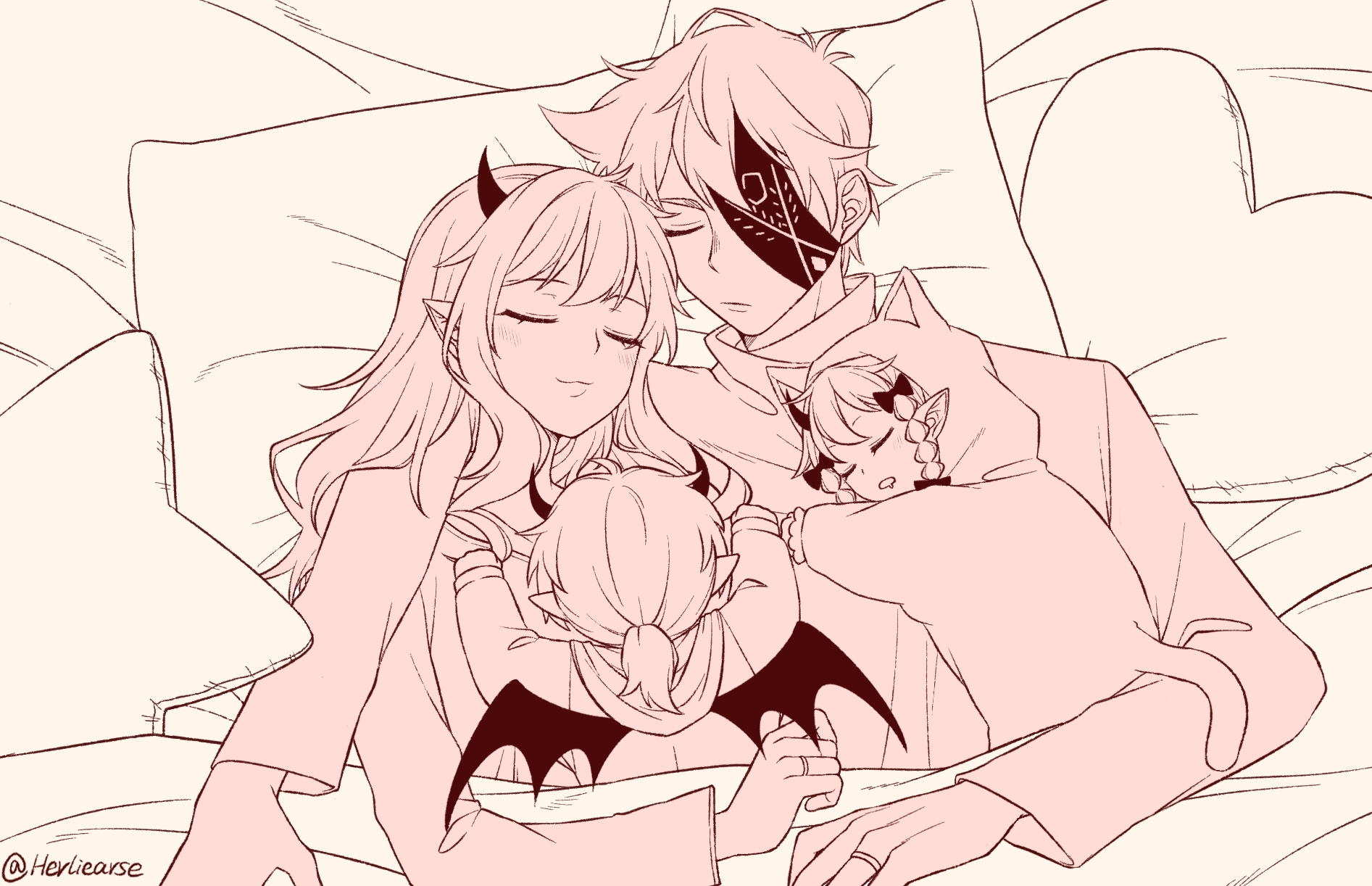 2boys 2girls :3 aged_down animal_hood arm_around_shoulder artist_name braid brother_and_sister cat_hood closed_eyes closed_mouth commentary_request demon_wings eyepatch father_and_child father_and_daughter father_and_son friday_night_funkin' head_on_pillow heart heart-shaped_pillow herliearse highres hood hood_up horns humanization husband_and_wife jewelry limited_palette long_hair long_sleeves mid-fight_masses mother_and_child mother_and_daughter mother_and_son multiple_boys multiple_girls onesie parent_and_child pillow pointy_ears ponytail rasazy_(mid-fight_masses) ring ruvyzvat_(mid-fight_masses) sarvente_(mid-fight_masses) selever_(mid-fight_masses) shirt short_hair siblings sidelocks simple_background single_horn star-shaped_pillow sweater turtleneck turtleneck_sweater twin_braids u_u under_covers wedding_ring wings