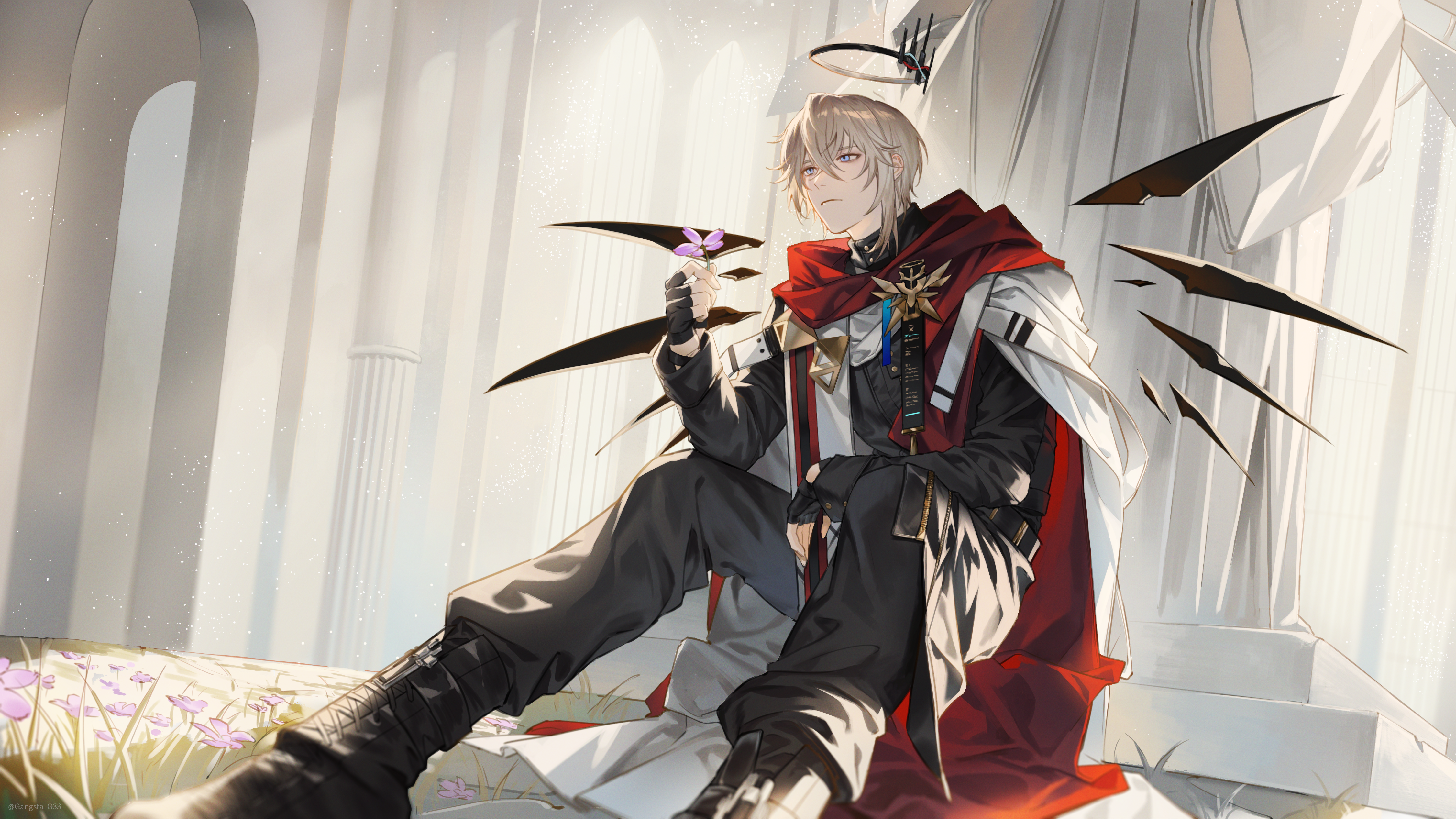 1boy absurdres against_wall arch arknights black_boots black_gloves black_shirt blonde_hair blue_eyes boots brooch capelet column commentary english_commentary executor_(arknights) executor_the_ex_foedere_(arknights) fingerless_gloves flower frown full_body gang_g gloves grey_pants halo highres holding holding_flower jewelry looking_afar making-of_available male_focus outdoors pants pillar purple_flower red_scarf scarf shirt solo statue white_capelet wings