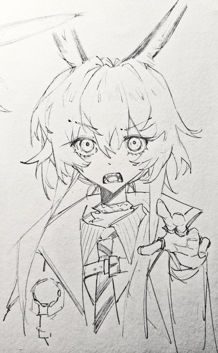 1girl amiya_(arknights) animal_ears arknights chikana. choker collared_shirt commentary diagonal-striped_clothes diagonal-striped_necktie eyelashes graphite_(medium) greyscale hair_between_eyes hand_up highres jacket long_sleeves looking_at_viewer monochrome necktie open_mouth rabbit_ears shirt short_hair_with_long_locks sidelocks solo striped_clothes traditional_media upper_body v-shaped_eyebrows white_background