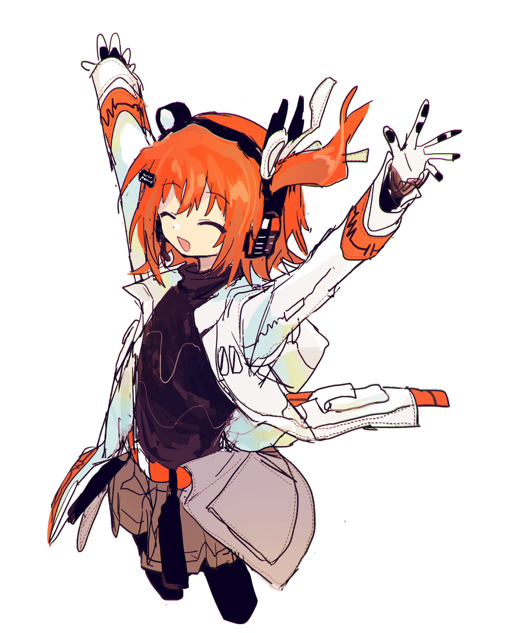 a.i._voice absurdres adachi_rei arms_up belt black_pantyhose black_shirt breasts closed_eyes cropped_legs gloves grey_shirt hair_ribbon headlamp headphones headset highres jacket long_sleeves microphone open_clothes open_jacket open_mouth orange_belt pantyhose radio_antenna ribbon sanotsuki_(mochi0101_831) shirt side_ponytail simple_background skirt utau white_background white_gloves white_jacket white_ribbon