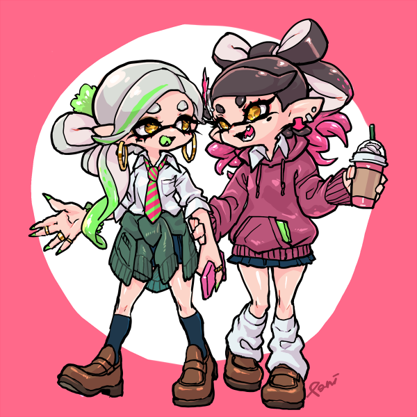 2girls alternate_costume alternate_hairstyle artist_name black_hair blue_skirt blue_socks bow-shaped_hair breast_pocket brown_footwear callie_(splatoon) cardigan cardigan_around_waist clothes_around_waist collared_shirt colored_tongue commentary_request cousins cross-shaped_pupils cup disposable_cup drawstring drinking_straw earrings fangs full_body gradient_hair green_cardigan green_hair green_nails green_necktie green_tongue grey_hair gyaru hand_on_another's_arm holding holding_cup holding_phone hood hood_down hoodie hoop_earrings inkling jewelry kneehighs loafers long_hair looking_at_another loose_socks marie_(splatoon) medium_hair miniskirt mole mole_under_eye multicolored_hair multiple_girls multiple_rings necktie nintendo open_mouth orange_eyes pani_spla parted_bangs phone pink_hair pink_hoodie pink_necktie pleated_skirt pocket pointy_ears ring school_uniform shirt shoes skirt sleeves_rolled_up smile socks splatoon_(series) standing streaked_hair striped_clothes striped_necktie stud_earrings symbol-shaped_pupils tentacle_hair two-tone_hair two-tone_necktie white_shirt white_socks yellow_pupils