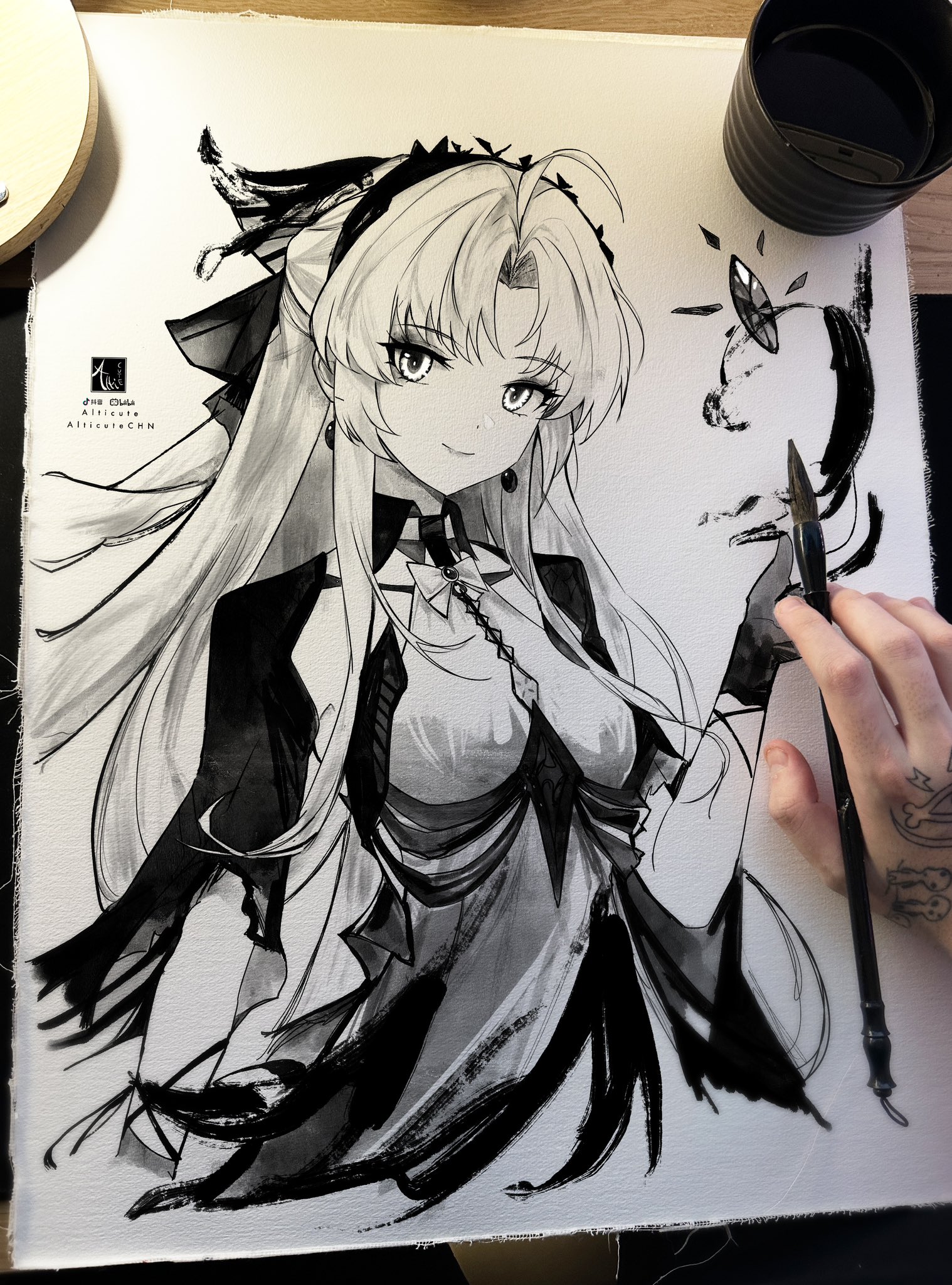 1girl ahoge alticute art_tools_in_frame artist_name bow bowtie breasts carlotta_(wuthering_waves) closed_mouth commentary cropped_torso curtained_hair dot_nose earrings english_commentary floating floating_object greyscale hand_up highres jewelry long_hair looking_at_viewer medium_breasts monochrome painting_(medium) smile solo traditional_media wuthering_waves