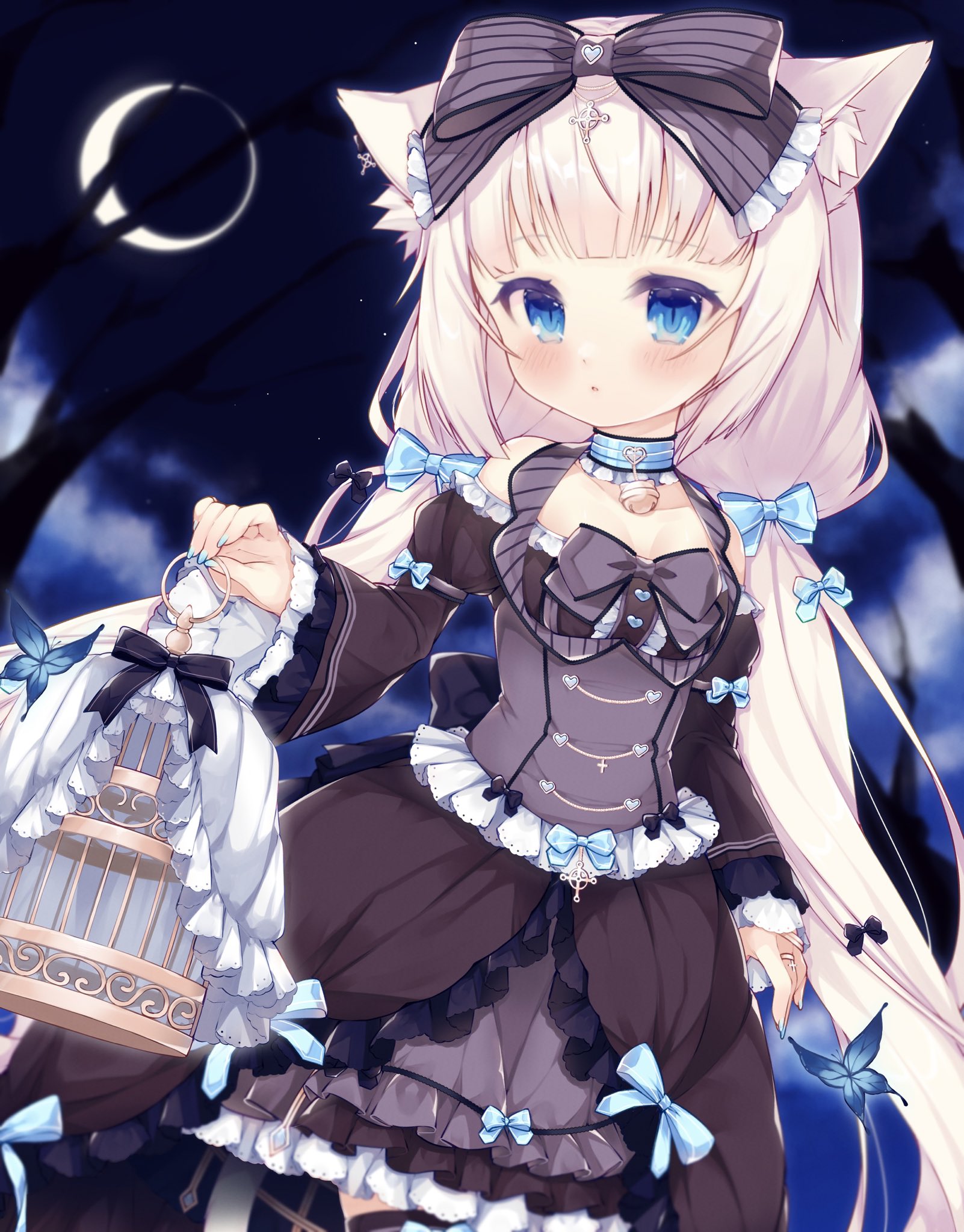 1girl animal_ear_fluff animal_ears bare_tree bell birdcage black_bow black_dress blue_bow blue_butterfly blue_choker blue_eyes blue_nails blunt_bangs bow bug butterfly c0mfortcha1n cage cat_ears cat_girl choker cloud collarbone cowboy_shot crescent detached_sleeves dress expressionless flat_chest hair_bow highres insect juliet_sleeves long_hair long_sleeves low_twintails moon multiple_hair_bows nail_polish neck_bell nekopara night outdoors parted_lips puffy_sleeves slit_pupils solo standing straight_hair tree twintails vanilla_(nekopara) very_long_hair white_hair