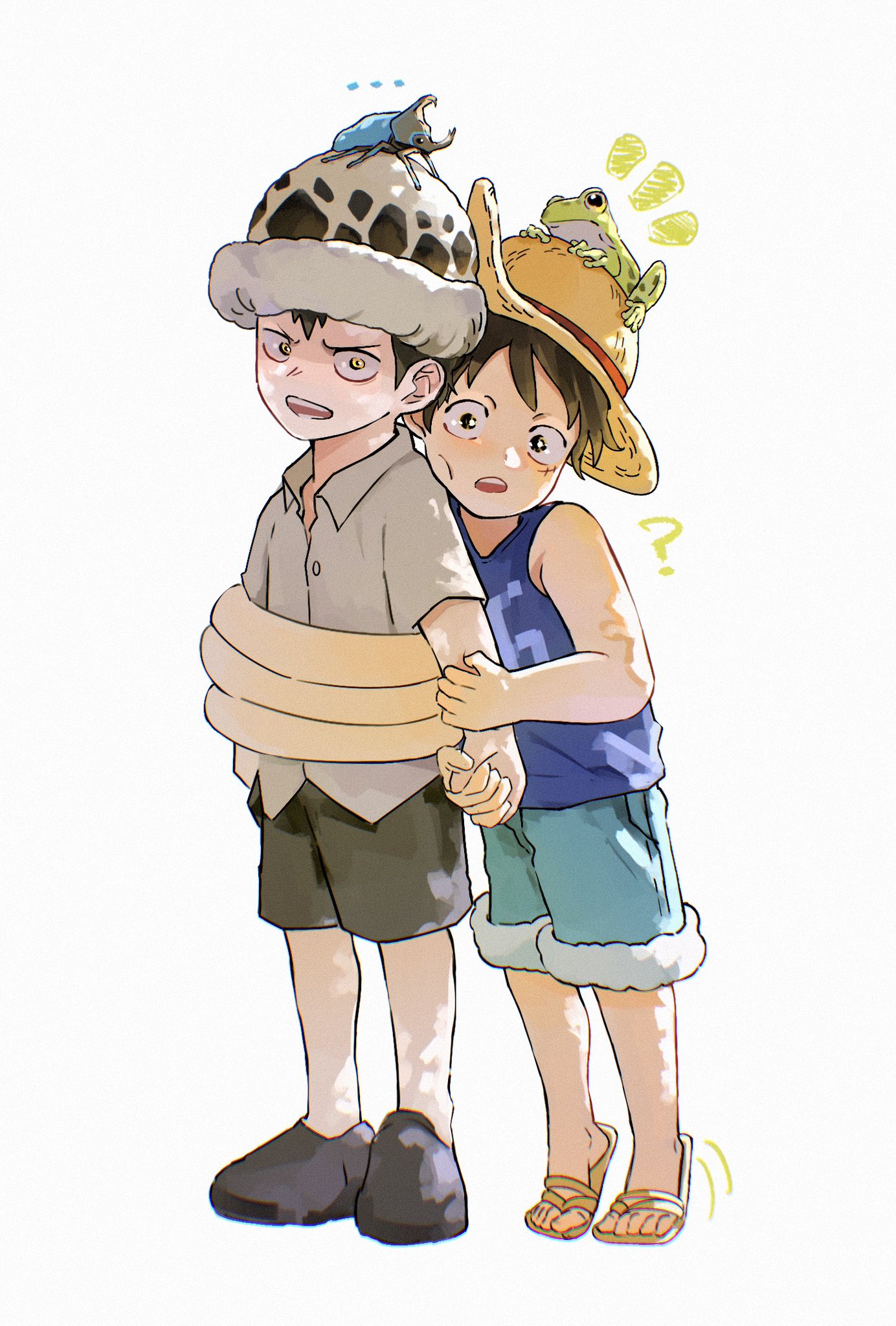 2boys ? aged_down beetle black_hair black_shorts blue_shorts blue_tank_top bug cha_(xtdk8zu) child collared_shirt facial_mark frog hat highres holding_hands hug insect looking_at_viewer monkey_d._luffy multiple_boys notice_lines on_head one_piece sandals scar scar_on_face shirt shorts simple_background straw_hat tank_top trafalgar_law white_background white_shirt