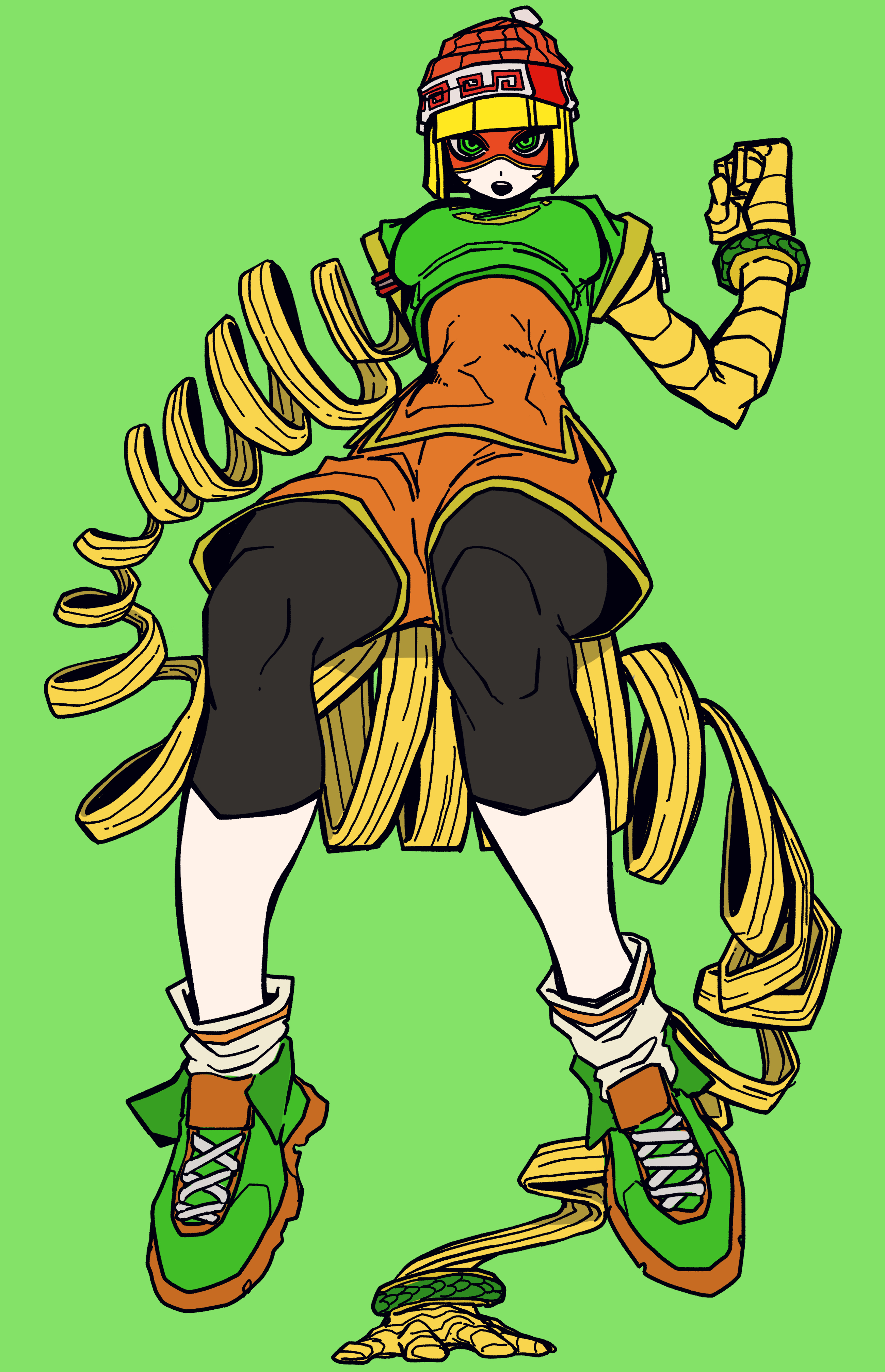 1girl absurdres arms_(game) beanie blonde_hair blunt_bangs bone_nigi bracelet extendable_limbs eye_mask green_background green_eyes green_shoes hat highres jewelry leggings leggings_under_shorts mask min_min_(arms) orange_shirt orange_shorts perspective shirt shoes short_hair shorts sneakers solo