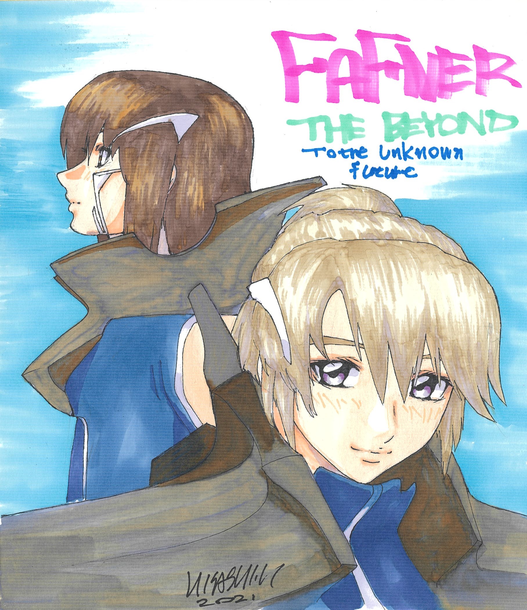 2021 2boys brown_hair highres hirai_hisashi minashiro_soushi multiple_boys purple_eyes shikishi signature soukyuu_no_fafner