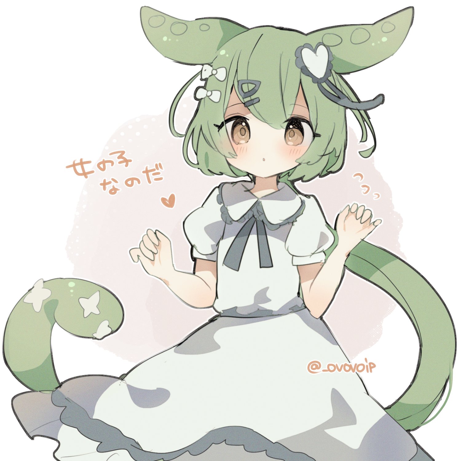 1girl blush bow brown_eyes commentary_request cowboy_shot dress expressionless flying_sweatdrops green_hair hair_bow hair_ornament hairclip hands_up heart heart_hair_ornament highres long_hair looking_at_viewer onnanoko_nanoda open_mouth pea_pod puffy_short_sleeves puffy_sleeves shirasuame_shiromaru short_sleeves solo song_name twitter_username very_long_hair voiceroid voicevox white_bow white_dress zundamon