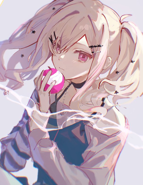 1girl apple bad_id bad_twitter_id black_choker blonde_hair choker closed_mouth food fruit grey_background hair_between_eyes hair_ornament hairclip hand_on_own_wrist hands_up holding holding_food holding_fruit holding_own_wrist inactive_account jewelry long_hair long_sleeves nanashiro_(7_shiro_) necklace pink_eyes pink_shirt project_sekai shirt sidelocks solo star_(symbol) star_hair_ornament tenma_saki twintails upper_body x_hair_ornament