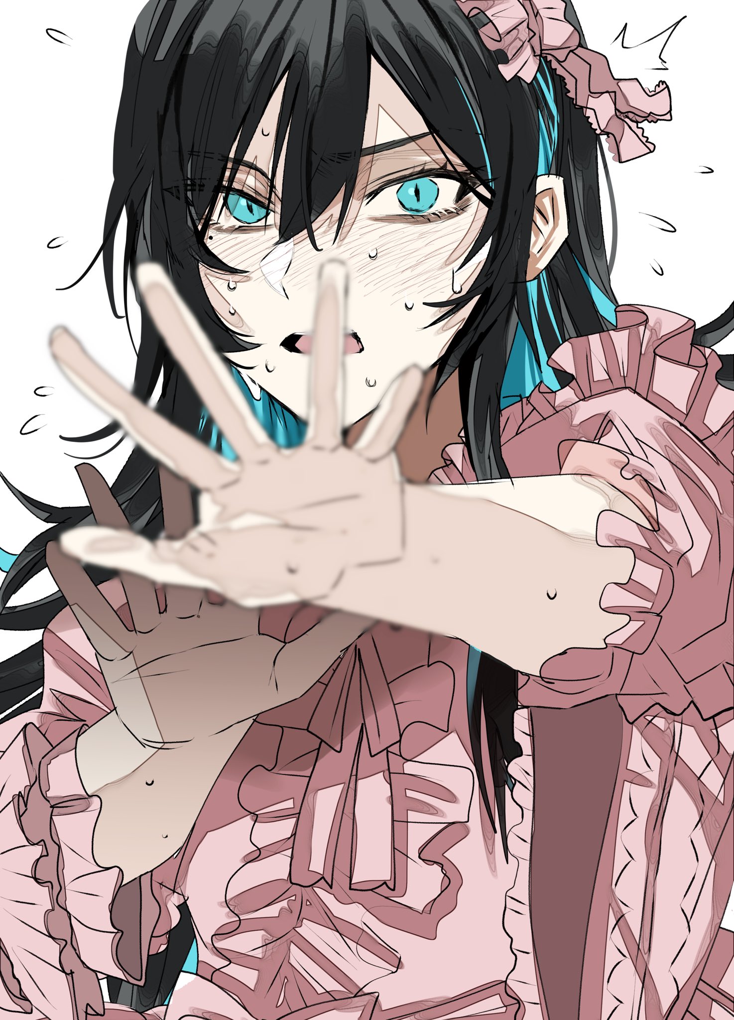 1girl ado_(utaite) black_hair blue_eyes blue_hair blurry blush center_frills chando_(ado) colored_inner_hair commentary_request depth_of_field dress frills gunjyou_(gunjyou_00) hair_between_eyes highres long_hair mole mole_under_eye multicolored_hair nervous_sweating open_mouth pink_dress pink_headdress short_sleeves sidelocks simple_background solo sweat upper_body utaite white_background