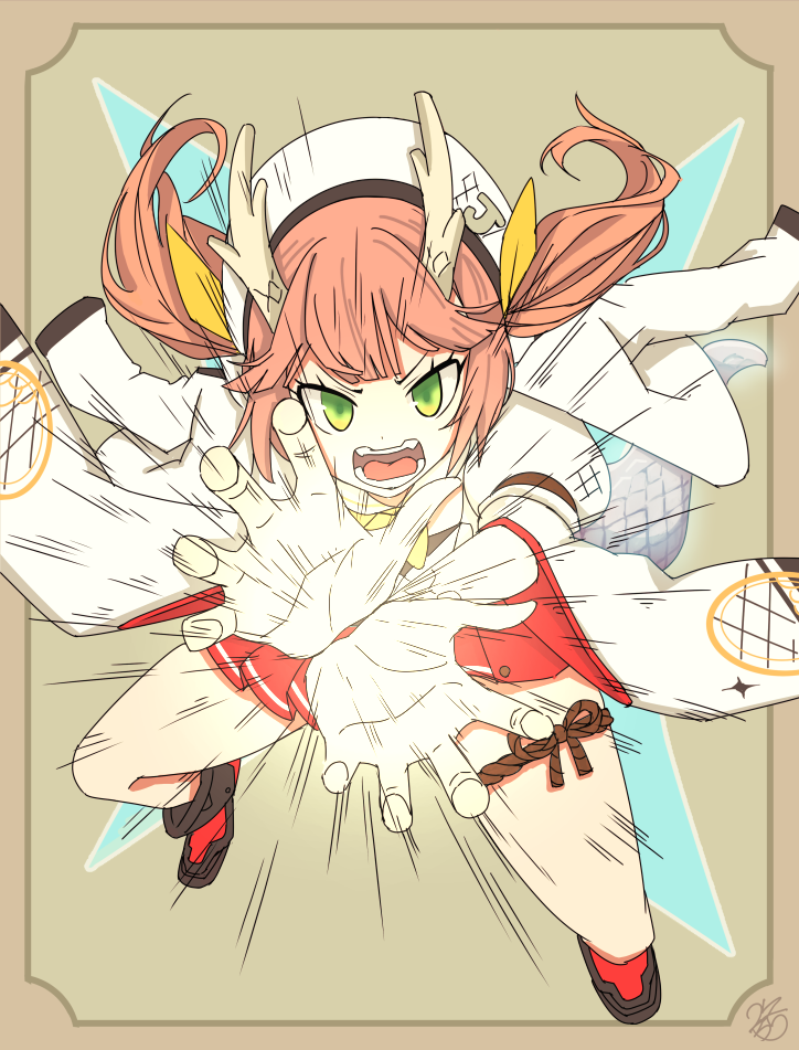 1girl azur_lane black_footwear coat coat_on_shoulders dragon_girl dragon_horns dragon_tail green_eyes hat horns kamehameha_(dragon_ball) looking_at_viewer open_mouth pink_hair reaching reaching_towards_viewer red_skirt ryuujou_(azur_lane) sakurai_kouji signature skirt solo tail twintails white_coat white_hat wide_sleeves