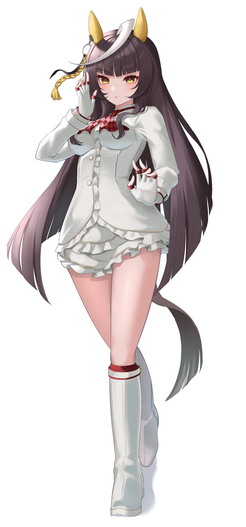 1girl alternate_costume animal_ears blunt_bangs boots breasts calstone_light_o_(umamusume) closed_mouth commentary_request fingerless_gloves gloves hair_between_eyes hair_ornament highres horse_ears horse_girl long_hair looking_at_viewer simple_background small_breasts solo standing takmi thighs umamusume white_background yellow_eyes