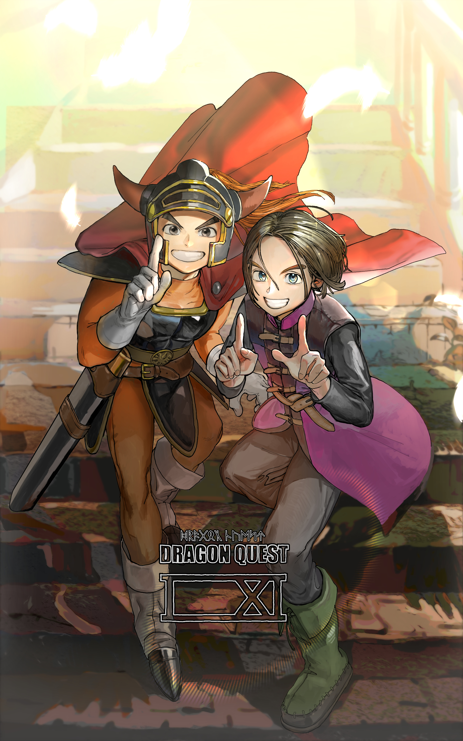2boys absurdres aretokasoretoka armor blue_armor blue_eyes blurry blurry_background bodysuit boots brown_hair cape commentary_request copyright_name dragon_quest dragon_quest_i dragon_quest_xi fake_horns falling_feathers feathers floating_cape floating_clothes floating_hair gloves grey_eyes grey_pants grin helmet hero_(dq1) hero_(dq11) highres horned_helmet horns in-franchise_crossover index_finger_raised looking_at_viewer male_focus multiple_boys on_stairs orange_bodysuit pants parted_hair purple_tunic red_cape red_horns scabbard sheath short_hair smile tunic v-shaped_eyebrows white_footwear white_gloves
