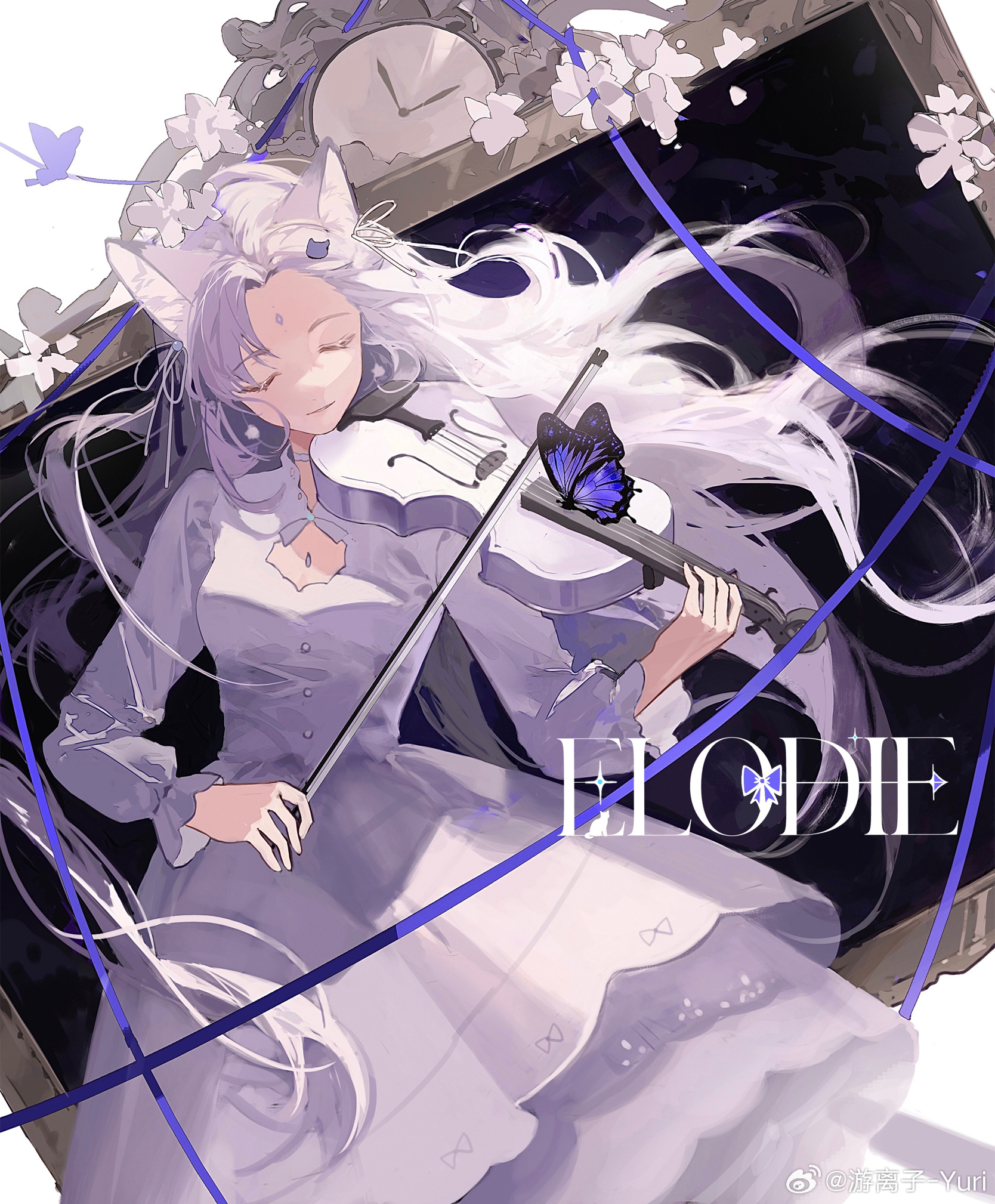 1girl animal_ear_fluff animal_ears bow bow_(music) bowtie bug butterfly buttons cat_ears chalkboard character_name character_request chest_jewel choker cleavage_cutout clock closed_eyes closed_mouth clothing_cutout collared_dress copyright_request cowboy_shot dress eyelashes floating_hair flower forehead forehead_jewel frilled_sleeves frills gem happy highres holding holding_bow_(music) holding_instrument holding_violin insect instrument light_particles long_hair long_sleeves music playing_instrument puffy_long_sleeves puffy_sleeves purple_butterfly purple_ribbon ribbon smile solo very_long_hair violin watermark weibo_watermark white_background white_bow white_bowtie white_choker white_dress white_flower white_gem white_hair youlizi-yuri