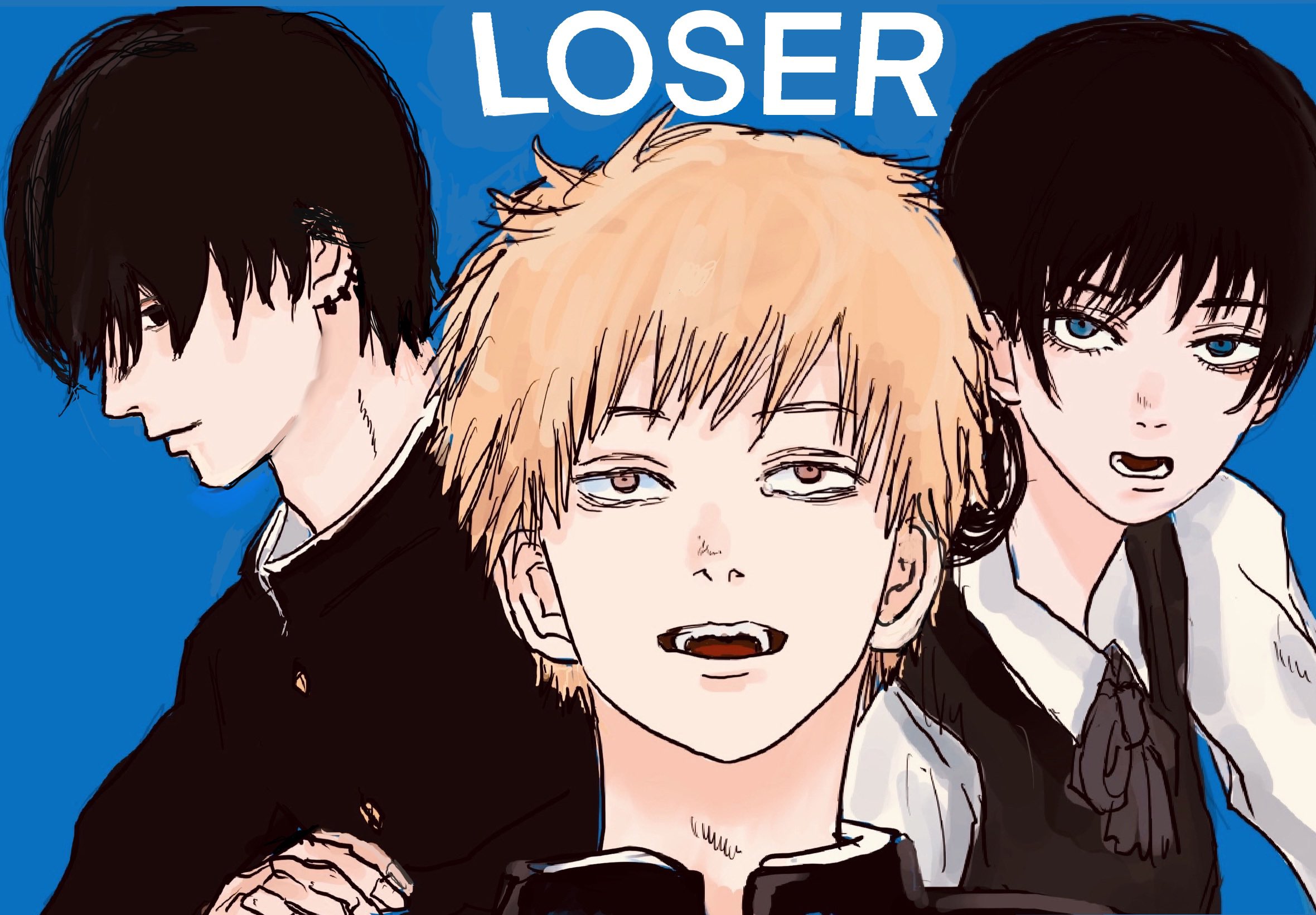 1girl 2boys black_dress black_eyes black_hair black_jacket black_ribbon blonde_hair blue_background blue_eyes brown_eyes chainsaw_man collared_shirt denji_(chainsaw_man) dress ear_piercing gakuran highres jacket medium_hair mitaka_asa multiple_boys neck_ribbon open_mouth piercing pinafore_dress ribbon school_uniform shirt short_hair sky8bow sleeveless sleeveless_dress white_shirt yoshida_hirofumi