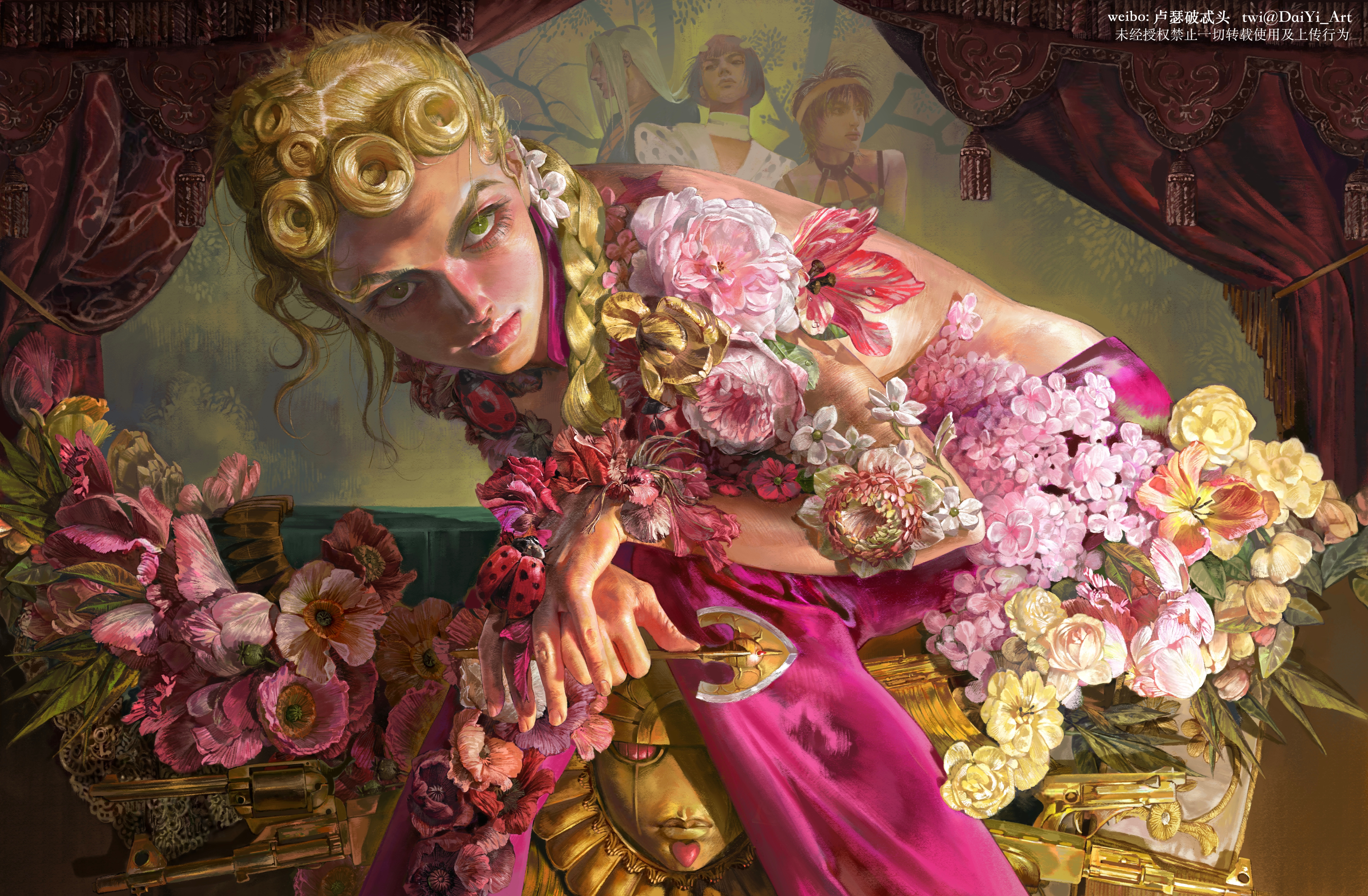 1boy absurdres androgynous arrow_(jojo) arrow_(projectile) artist_name bishounen blonde_hair blush braid braided_ponytail bruno_bucciarati bug chinese_commentary chrysanthemum closed_mouth commentary curtains eyelashes flower flower_on_shoulder giorno_giovanna gold gold_experience golden_gun green_eyes gun highres holding holding_arrow insect insect_on_finger iris_(flower) jasmine_(flower) jojo_no_kimyou_na_bouken ladybug leone_abbacchio looking_at_viewer male_focus mixed-language_commentary mural narancia_ghirga painterly pants peony_(flower) pink_flower pink_lips pink_pants poppy_(flower) realistic single_braid sitting tassel too_many_flowers topless_male tudou_estor tulip twitter_username vento_aureo watermark weapon weibo_username yellow_flower yellow_tulip